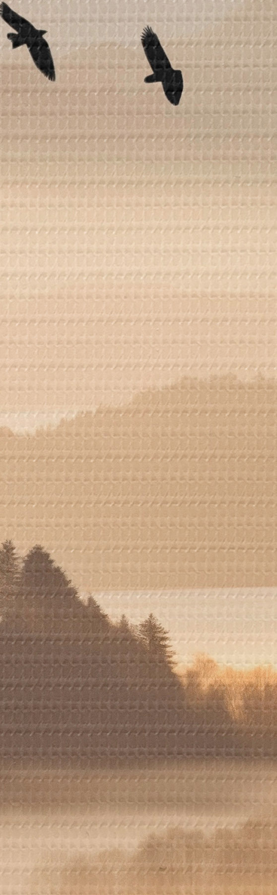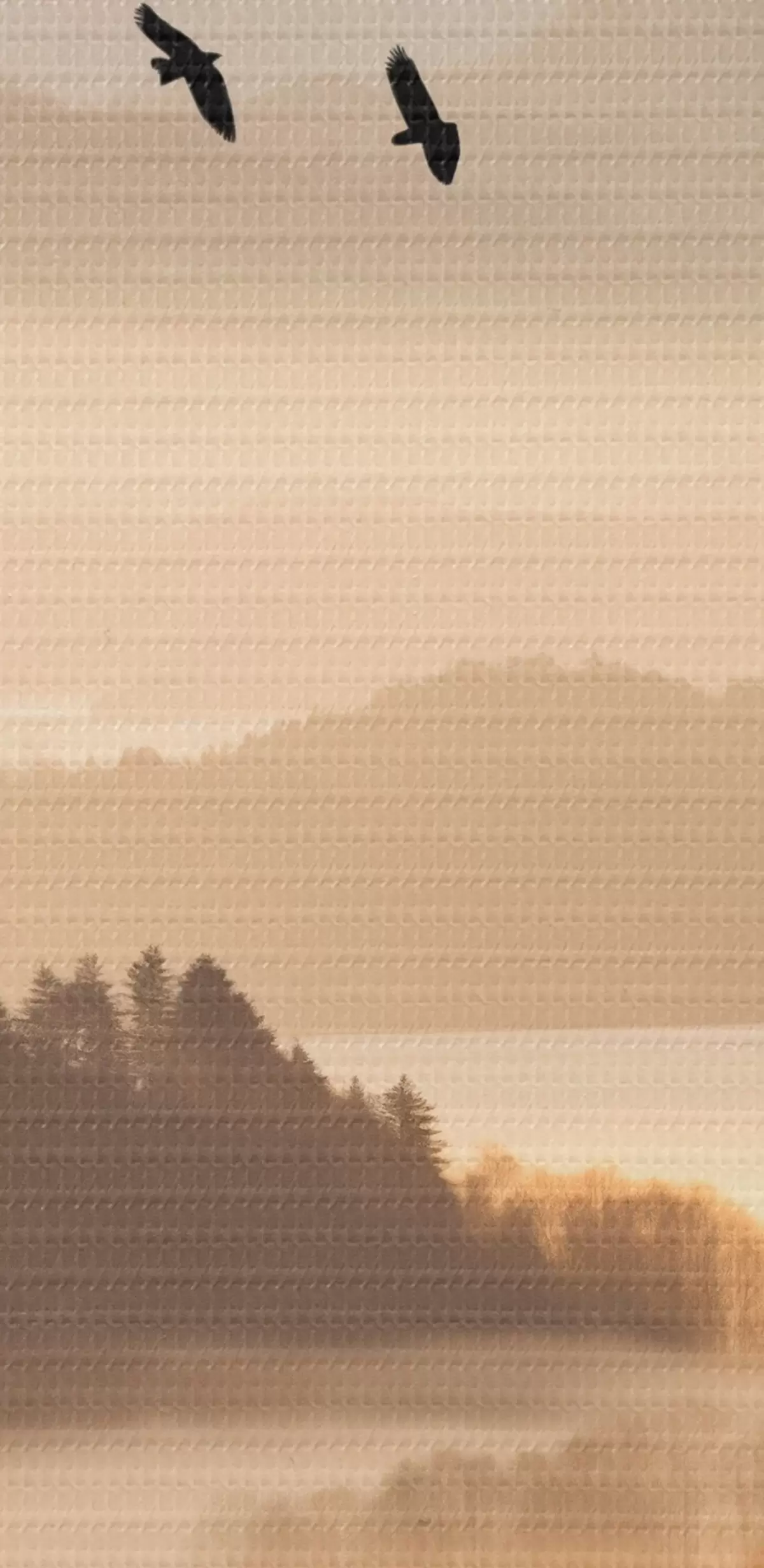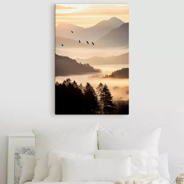 Maalid Mägimaastik koos metsa ja taevas lendavate lindudega , kõik kaetud paksu udukihiga päikesetõusu ajal Nr s45564