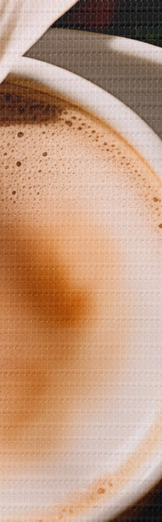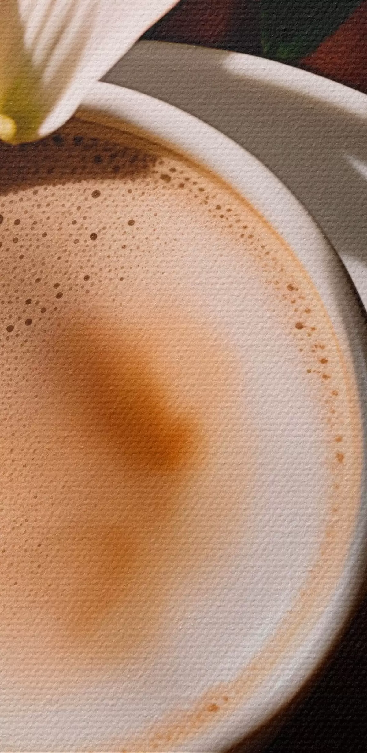 Maalid Tass kohvi koos vahuga valgel taldrikul, taustal mõned lilled, päikesevalguses Nr s45569
