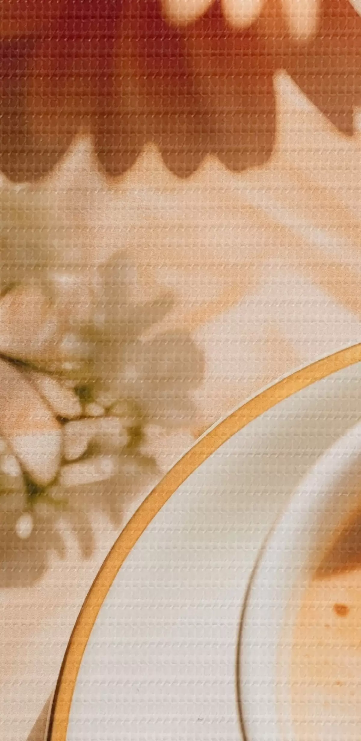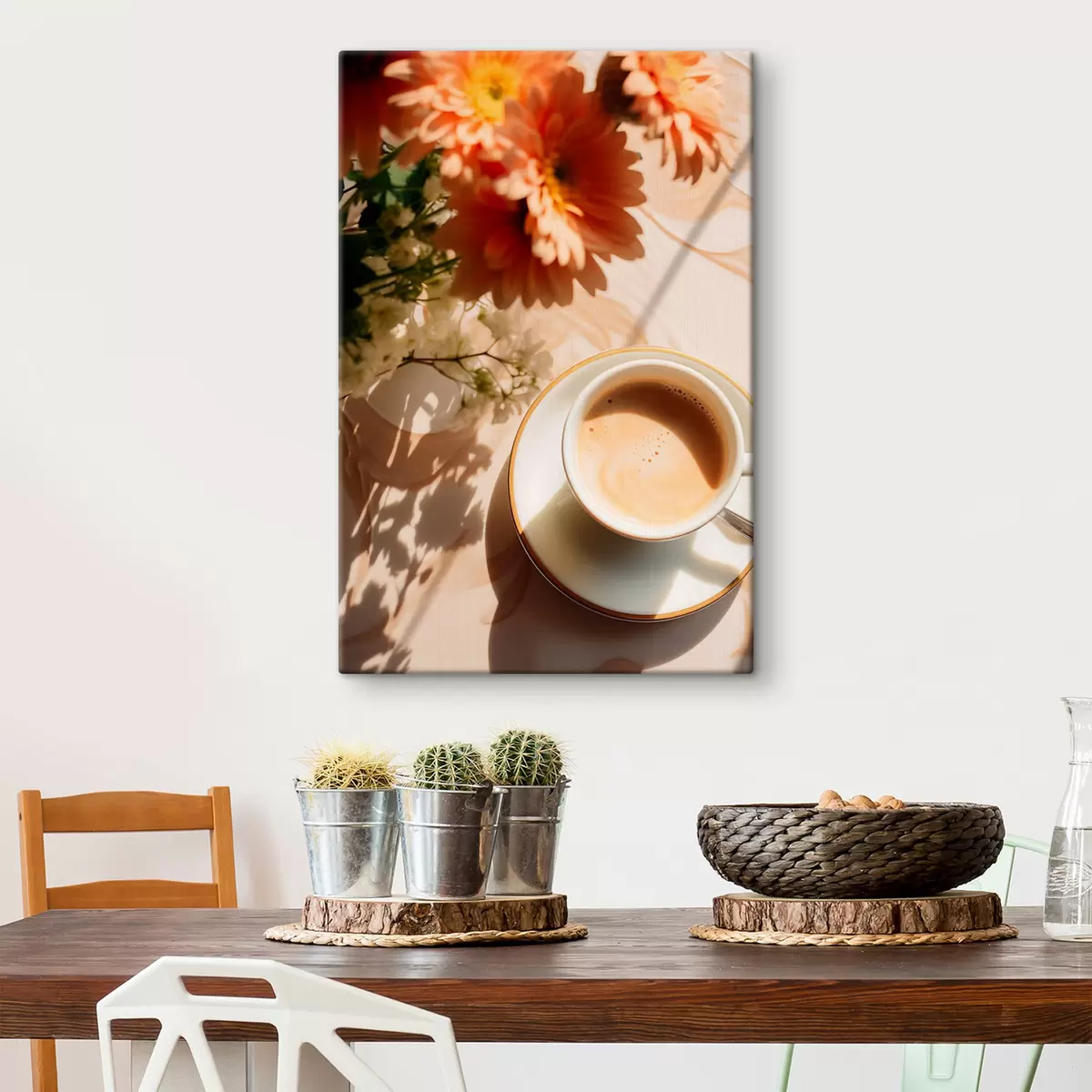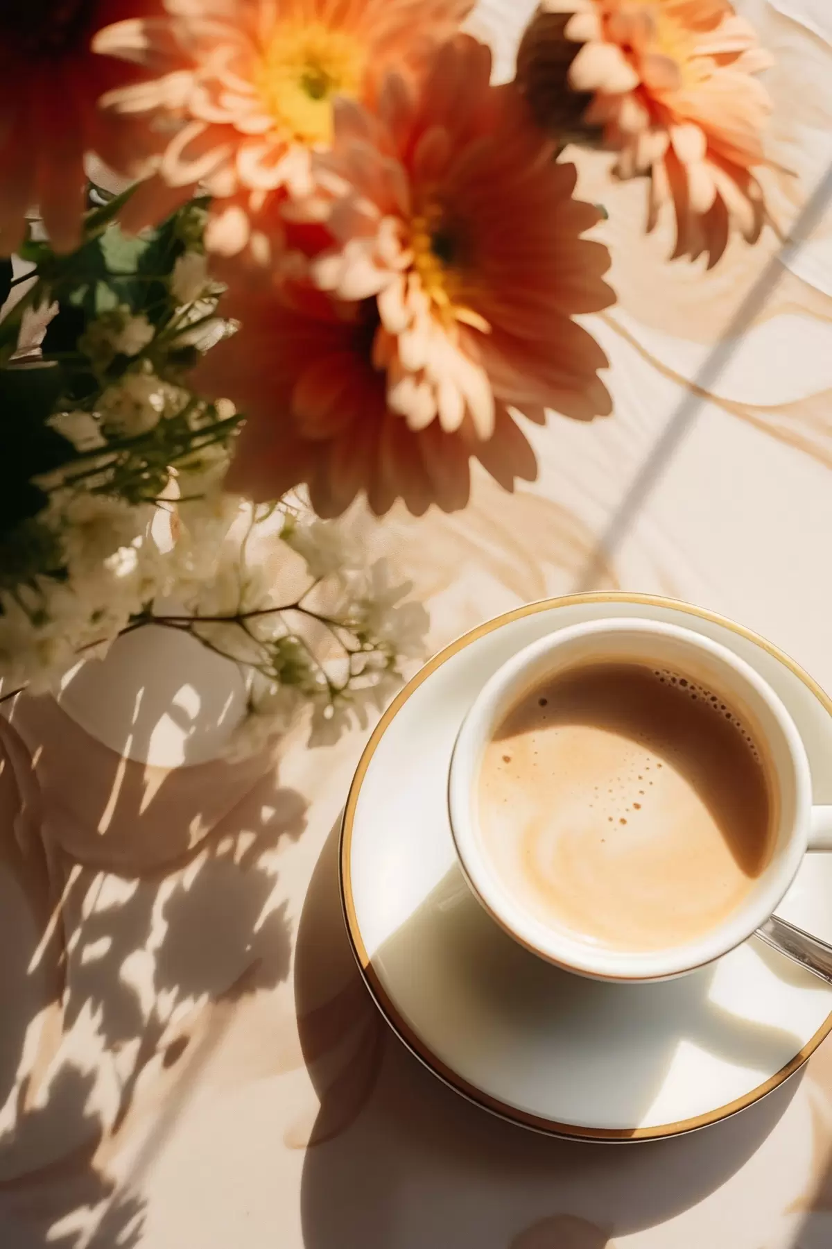 Maalid Tass kohvi koos vahuga valgel taldrikul, taustal mõned lilled, päikesevalguses Nr s45570