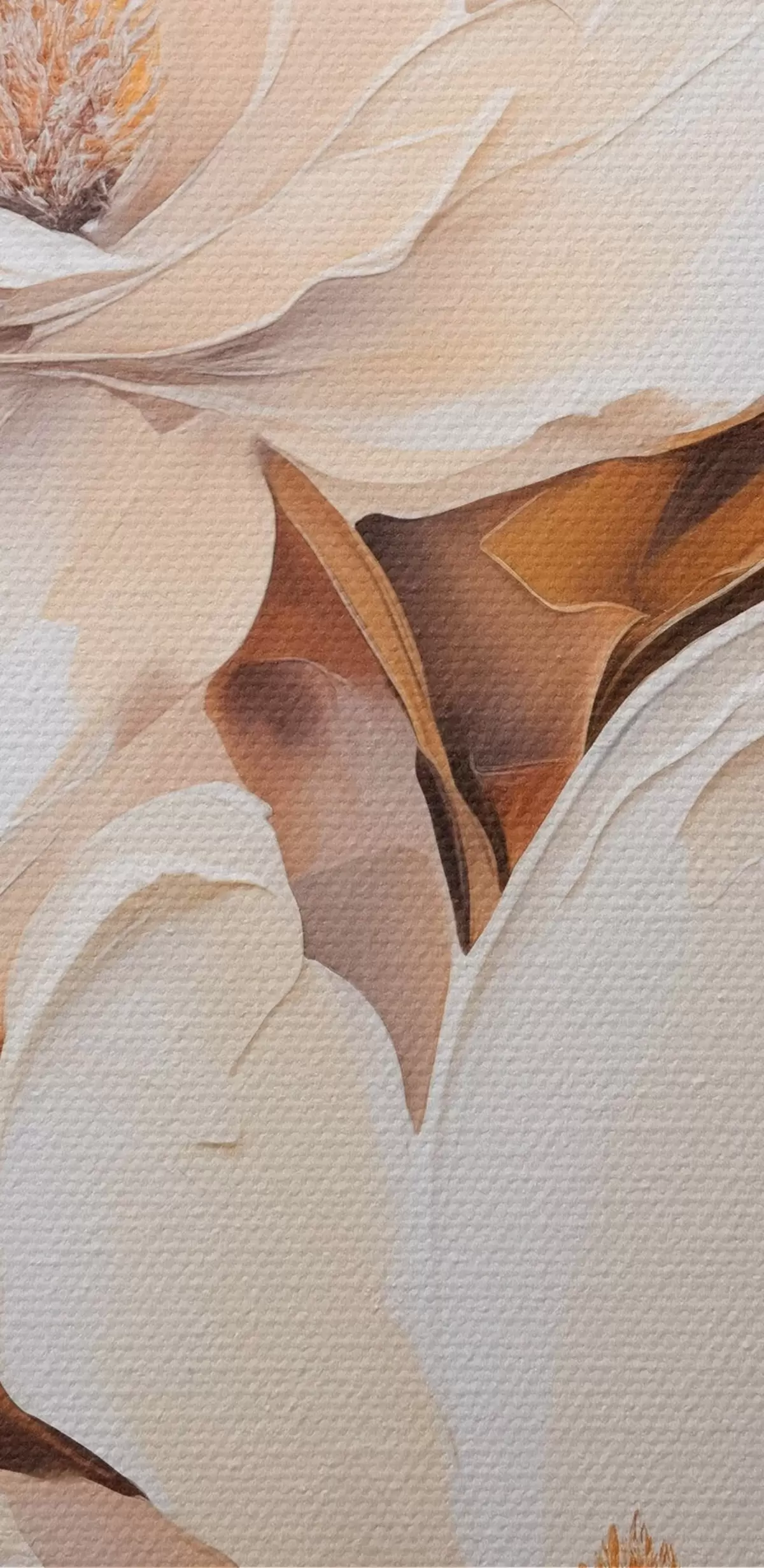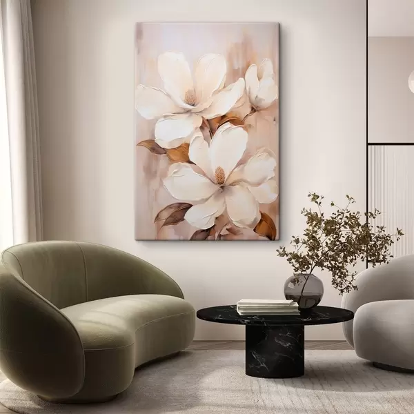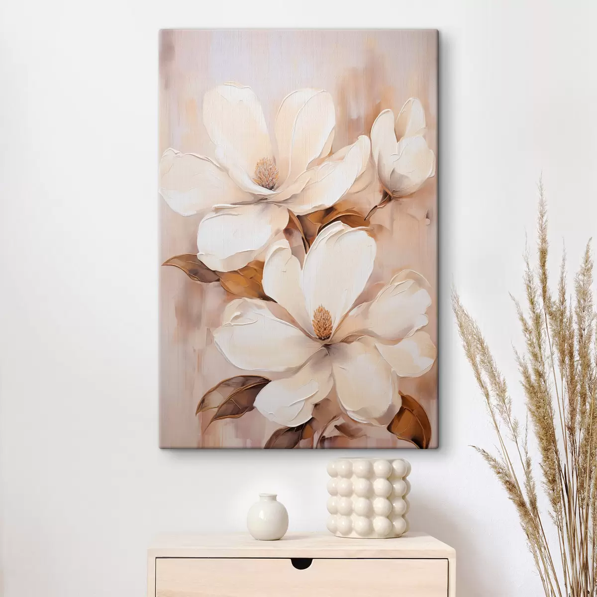 Maalid Valged magnoolia lilled pehmel, hägustatud beeži ja pruuni tooni taustal, maalimisstiil Nr s45572