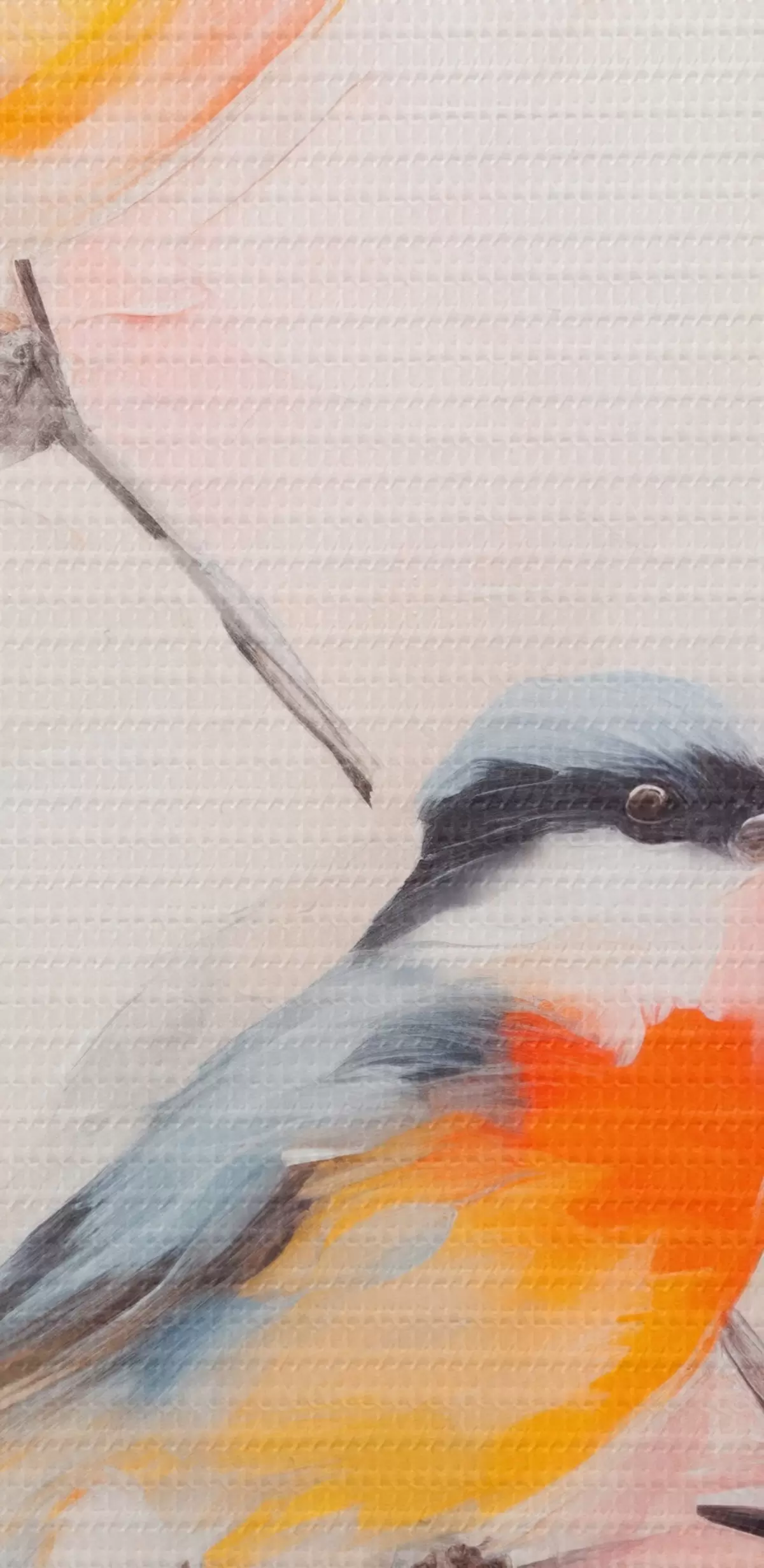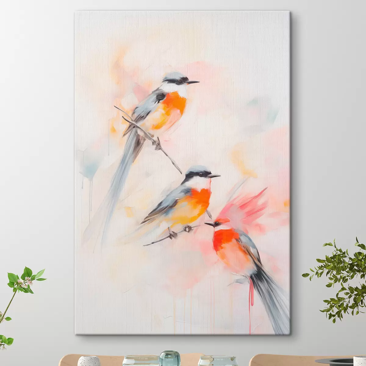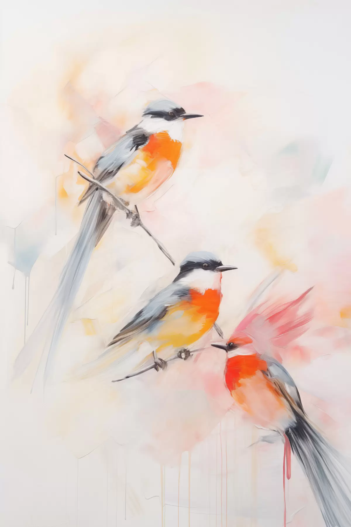 Maalid Oksadel istuvad linnud, pehmed pastelsed värvid, heledal taustal roosa ja valge toonid Nr s45577