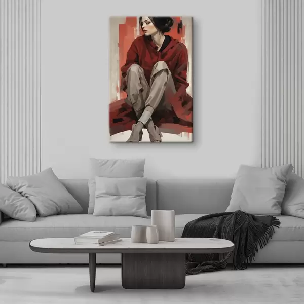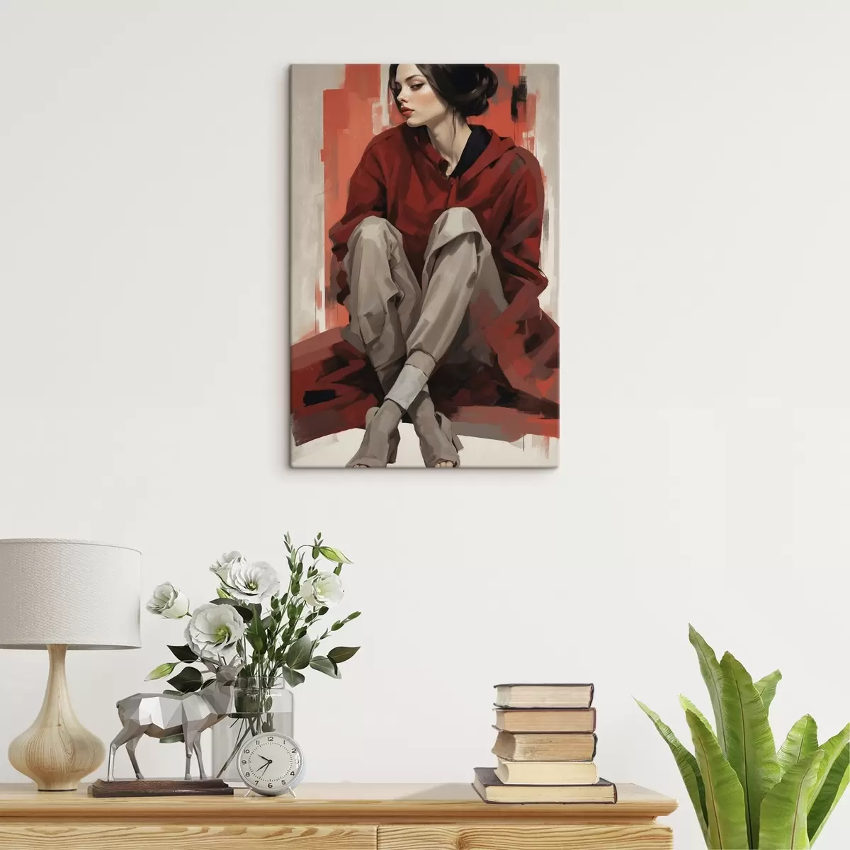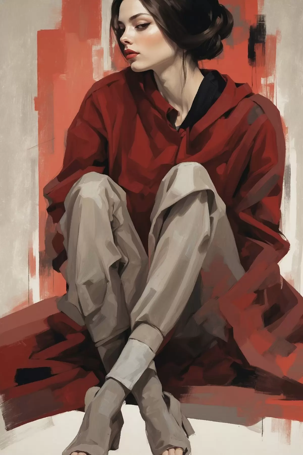 Maalid Tüdruk punases mantlis istub kokku pandud jalgadega Nr s45624