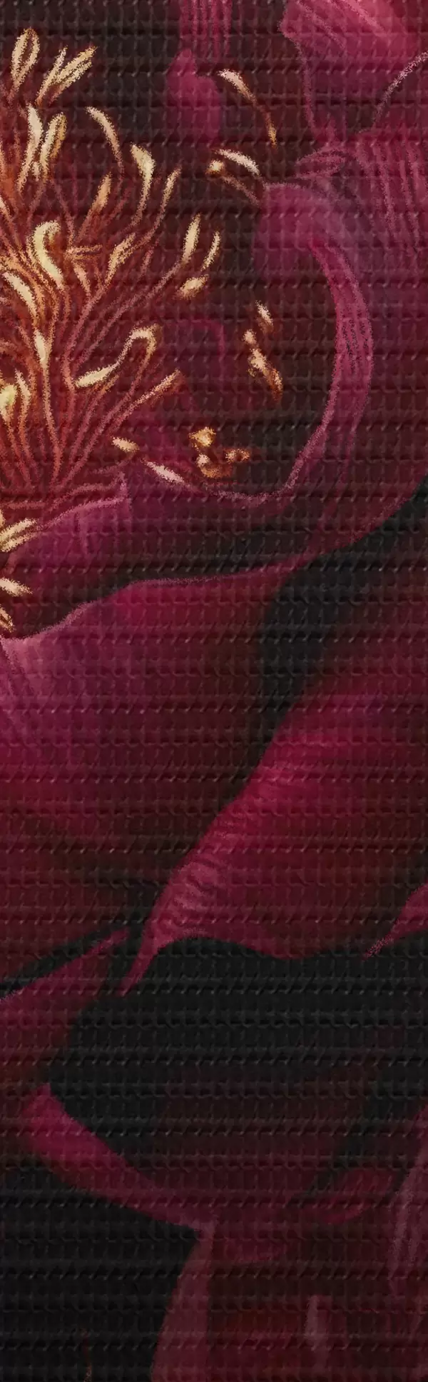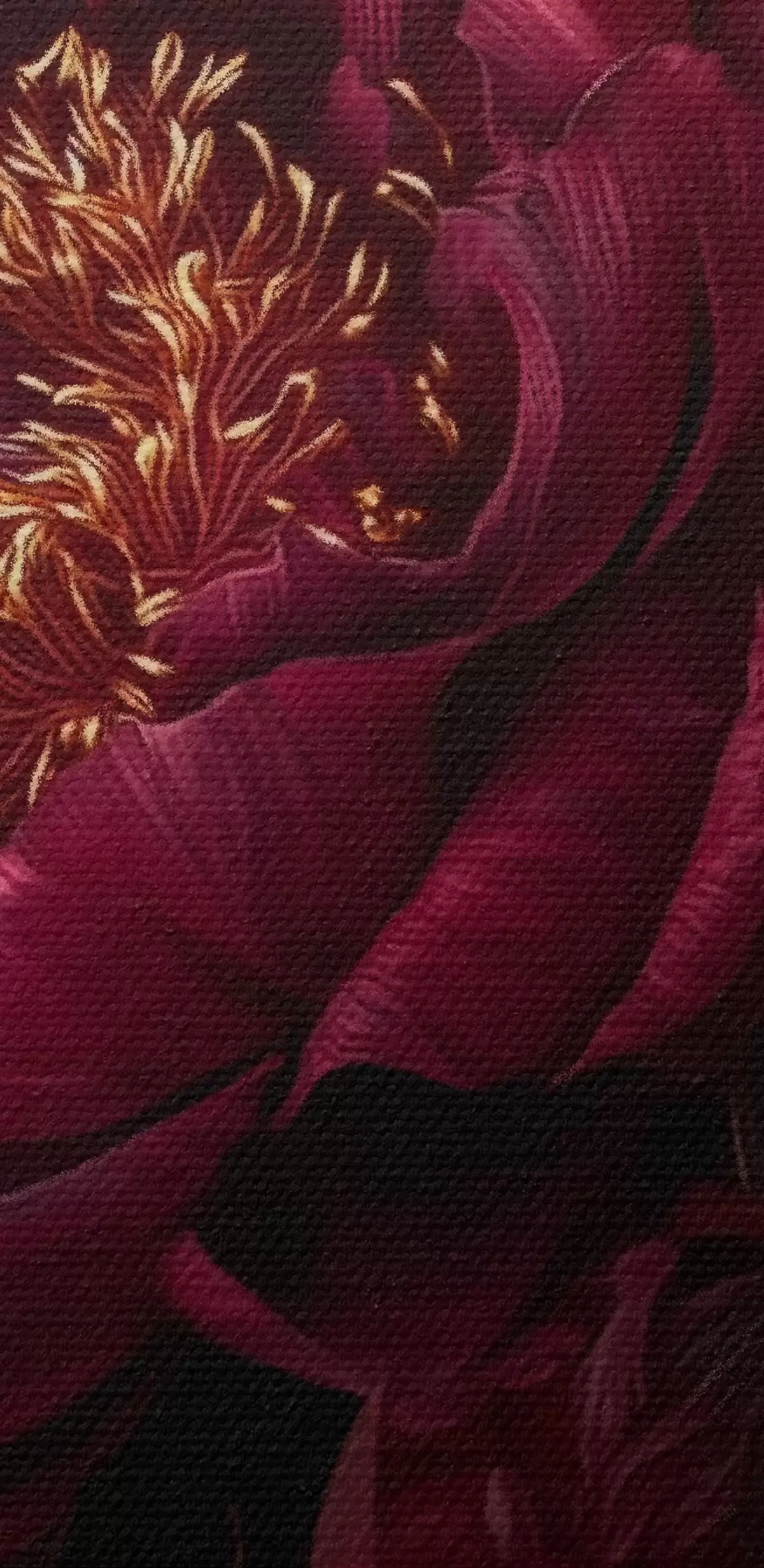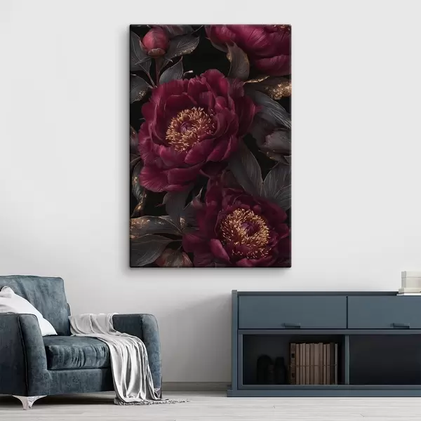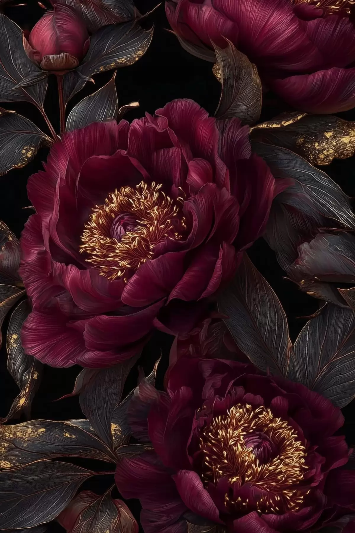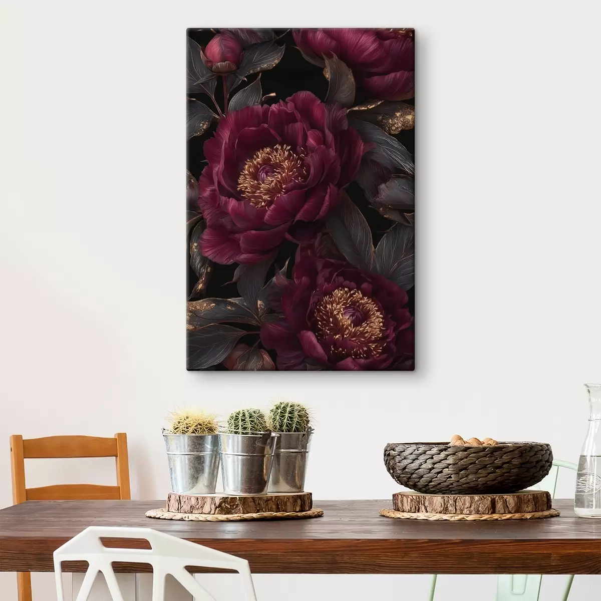 Maalid Burgundia peonid mustal taustal kollaste aksentidega Nr s45877
