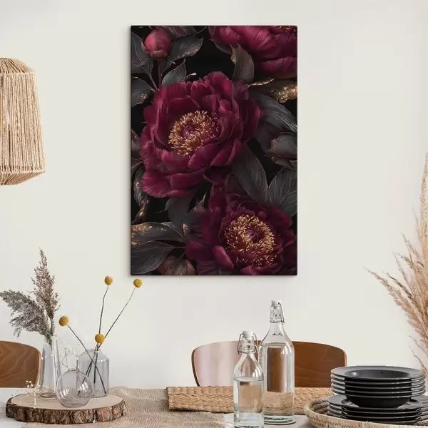 Maalid Burgundia peonid mustal taustal kollaste aksentidega Nr s45877