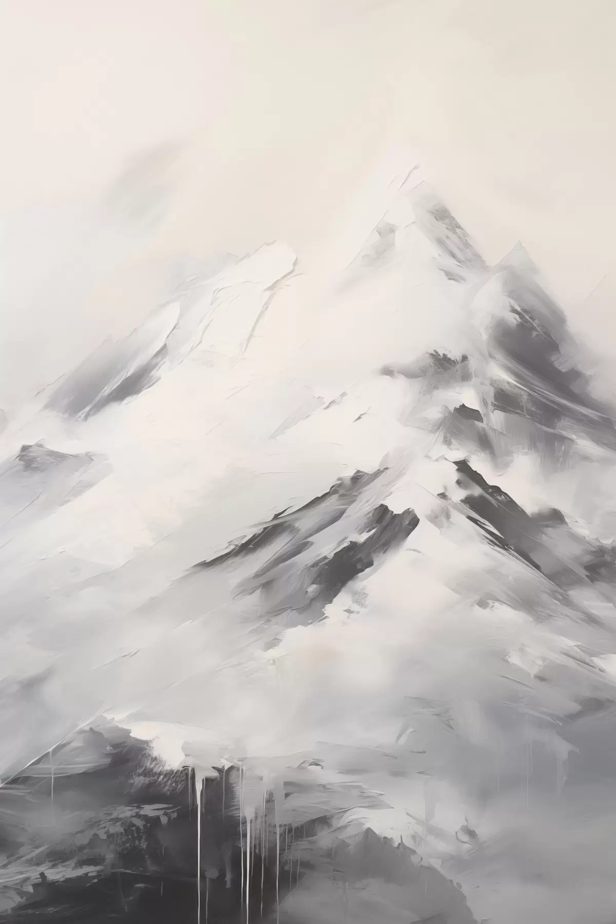 Maalid Lumised mäetipud hallide varjudega, hall taevas, pintslitõmbed, tekstuurne, minimalistlik Nr s45932