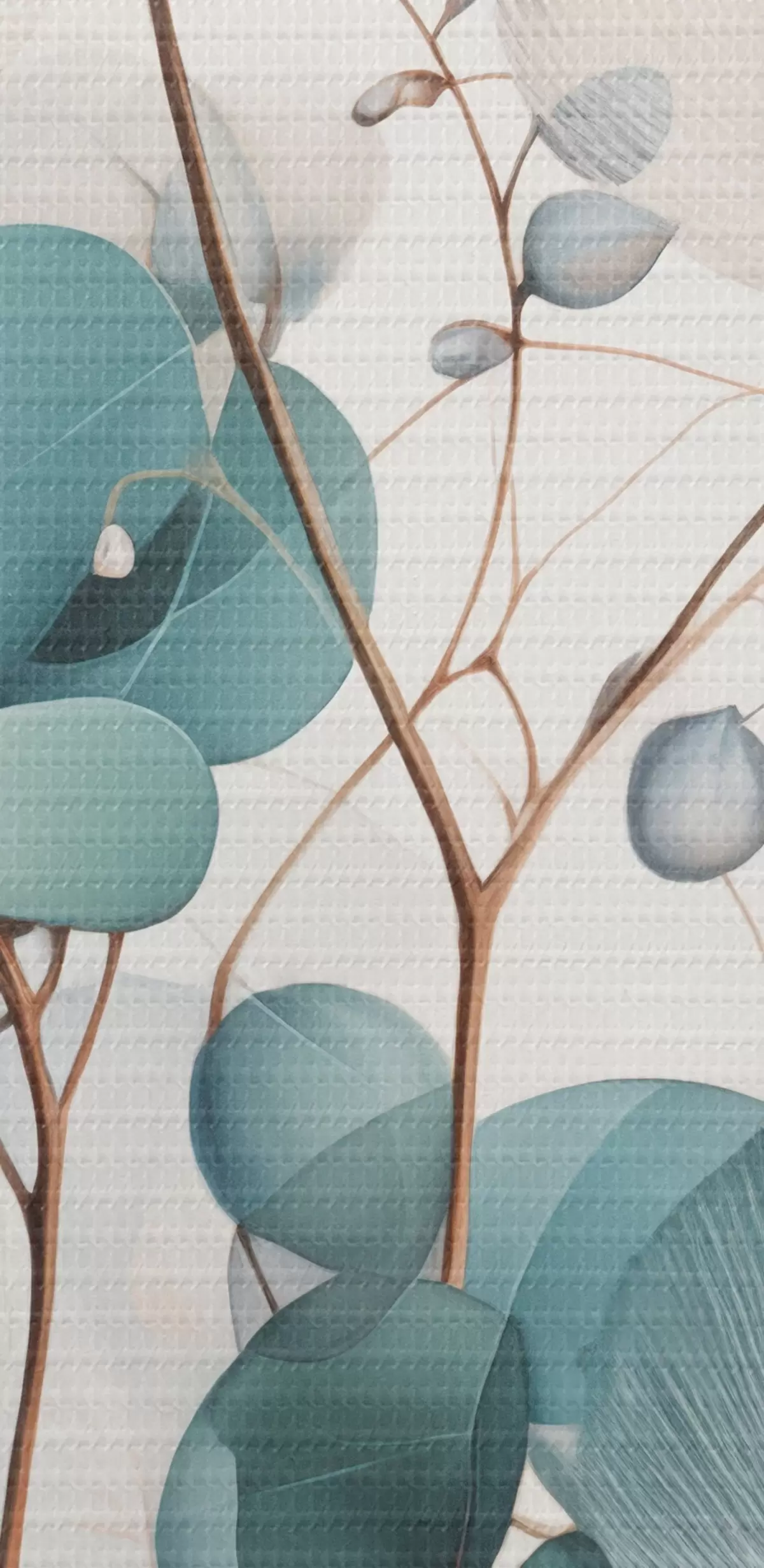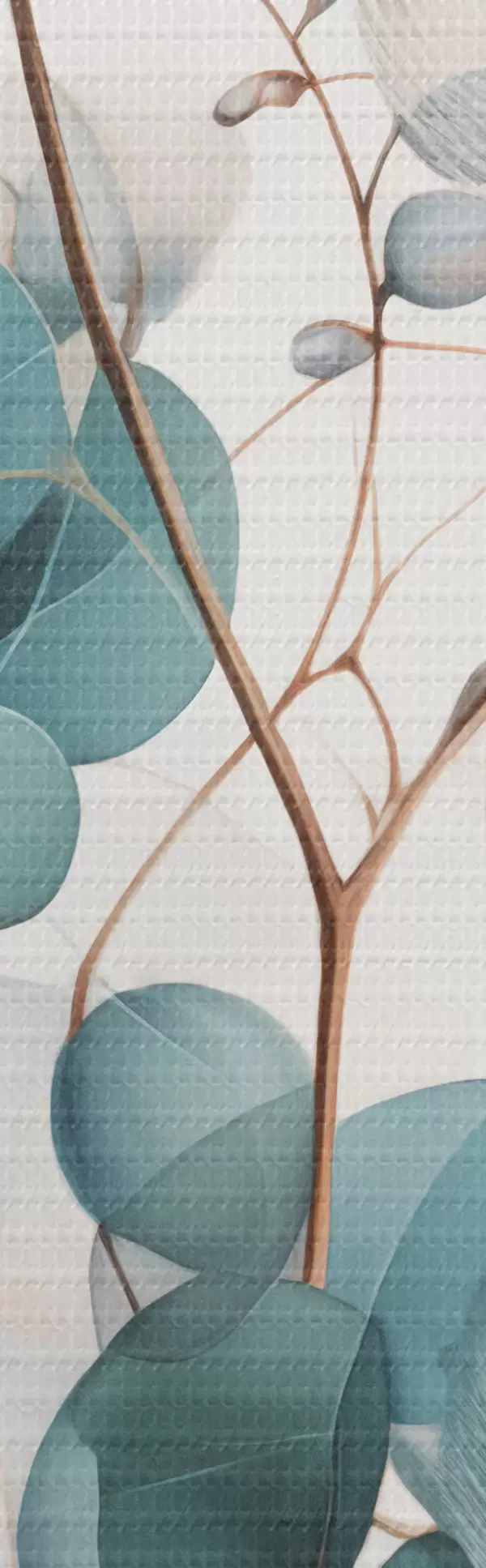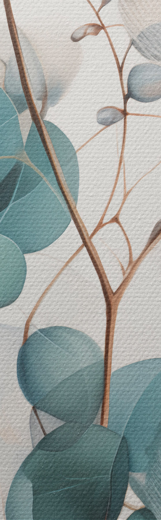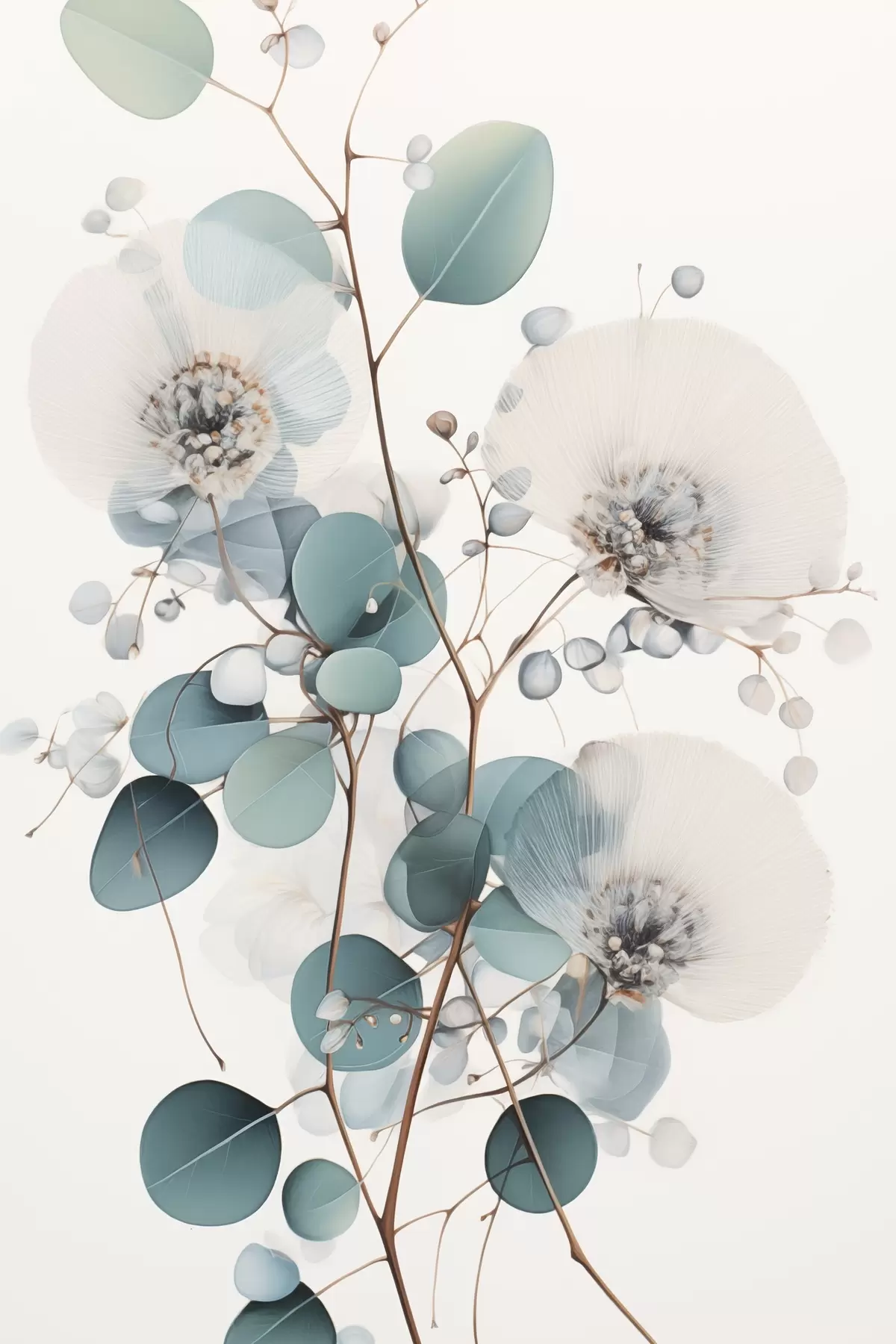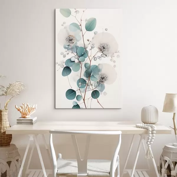 Maalid Eukalüpti abstraktsed õied valget värvi kroonlehtedega, oksadel tumerohelised lehed Nr s45946