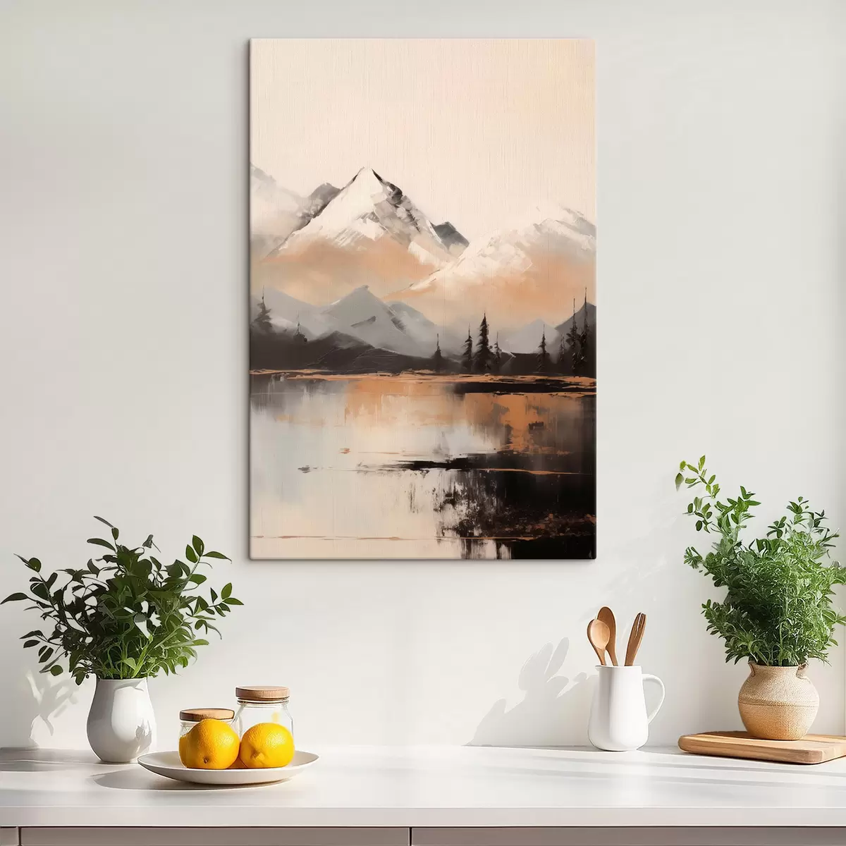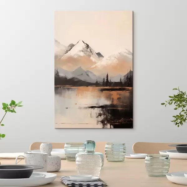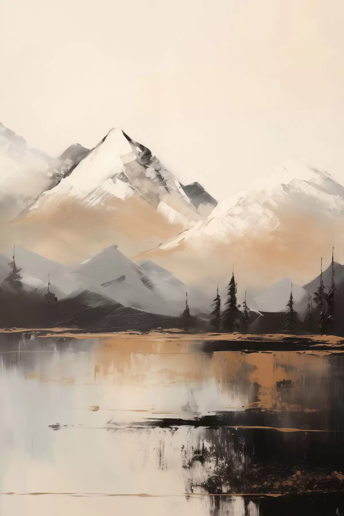 Maalid Lumised tekstuuriga mäed mõne puuga järve ees Nr s45951