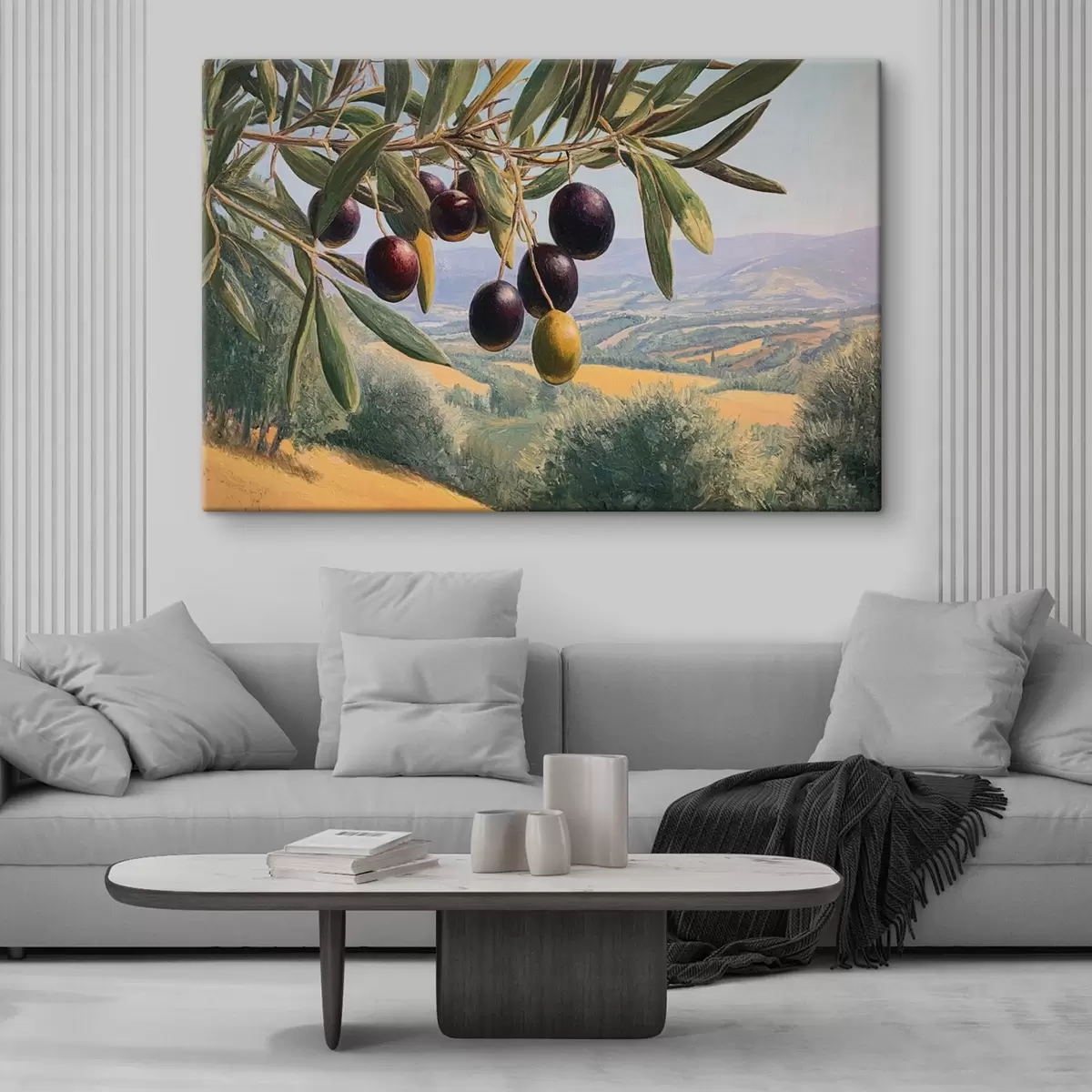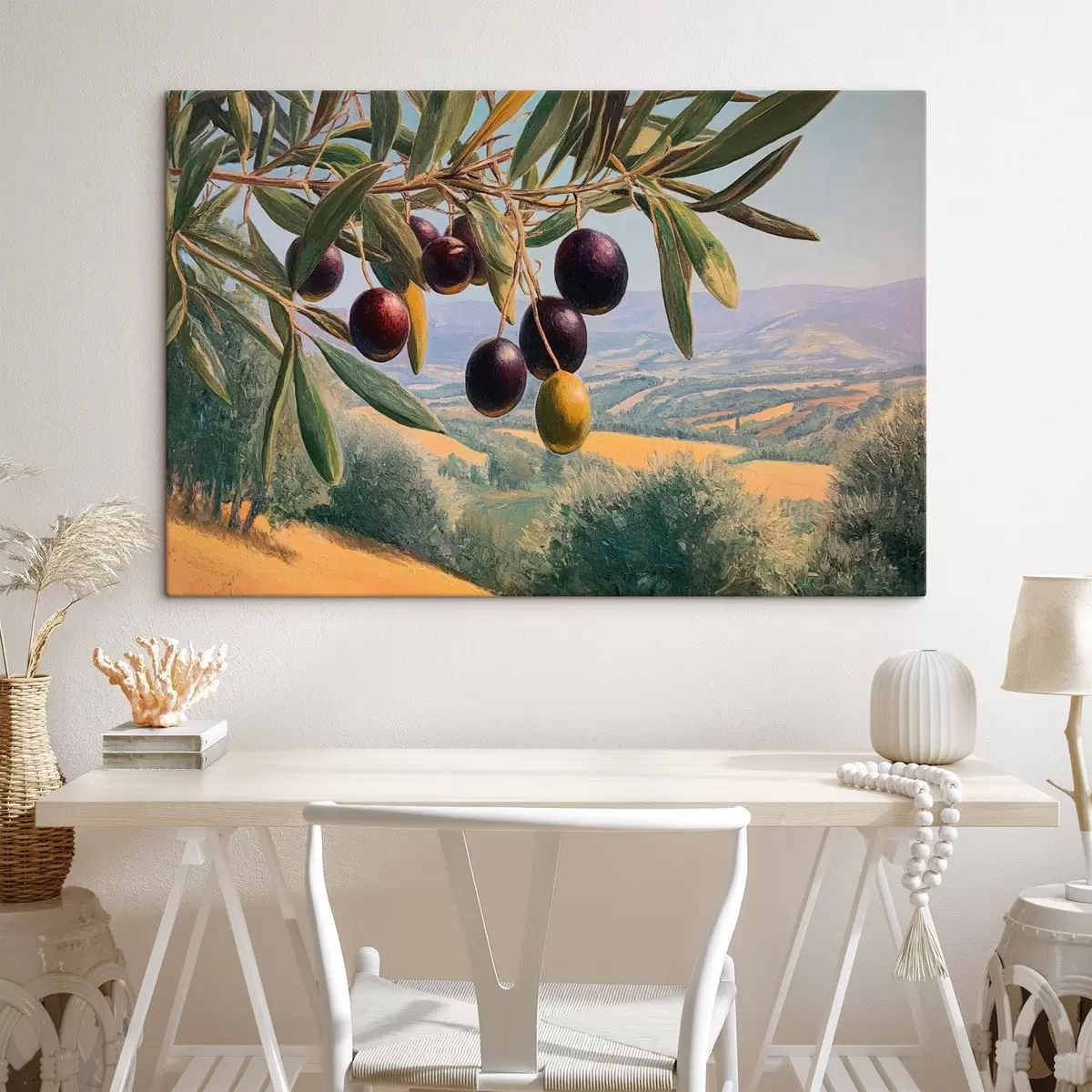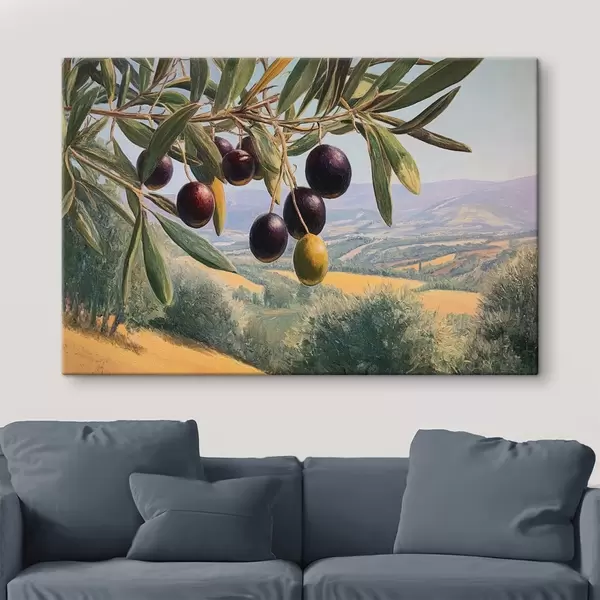 Maalid Oliivipuu oks tumedate viljadega suvise maastiku taustal Nr s46150