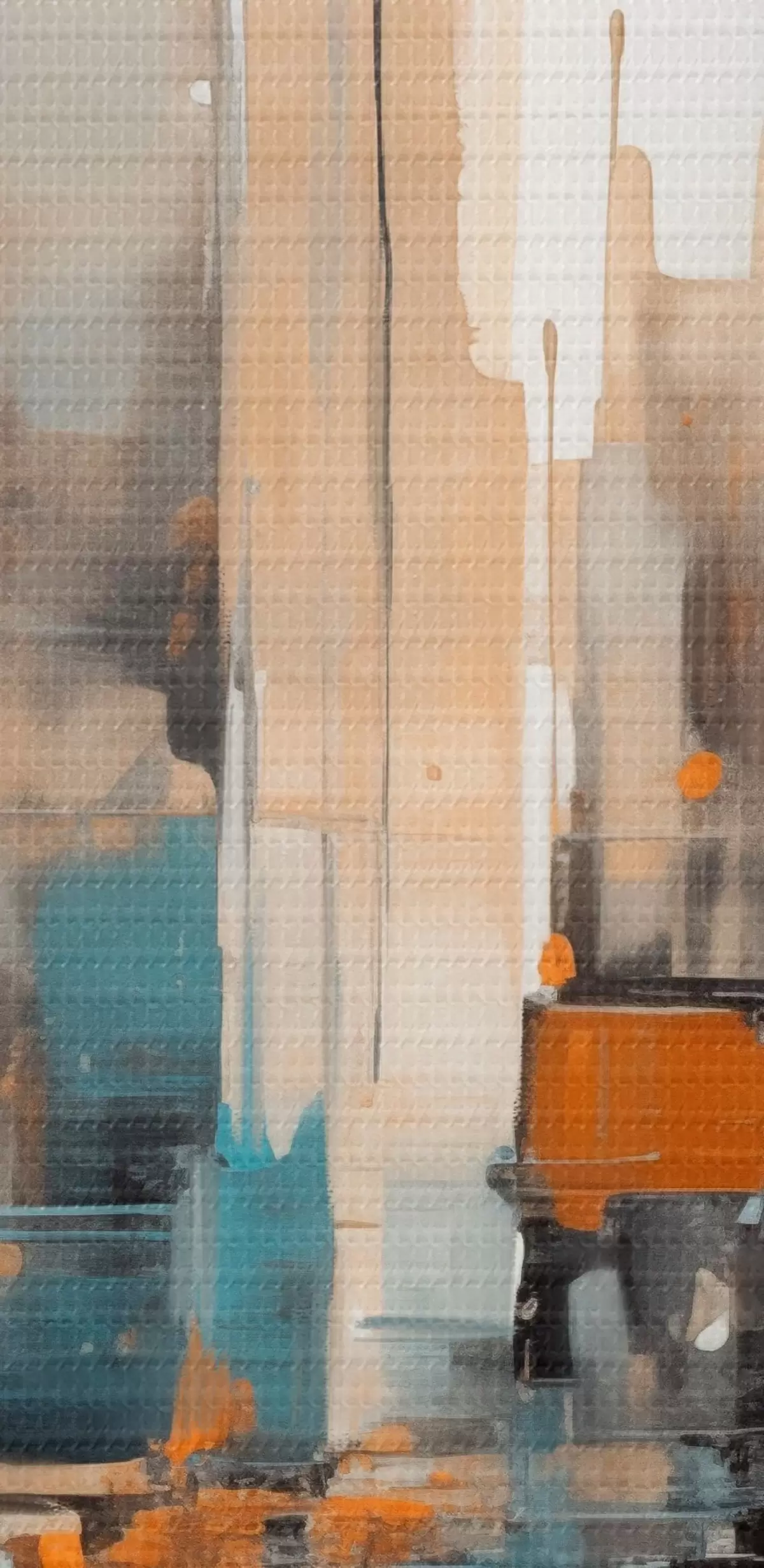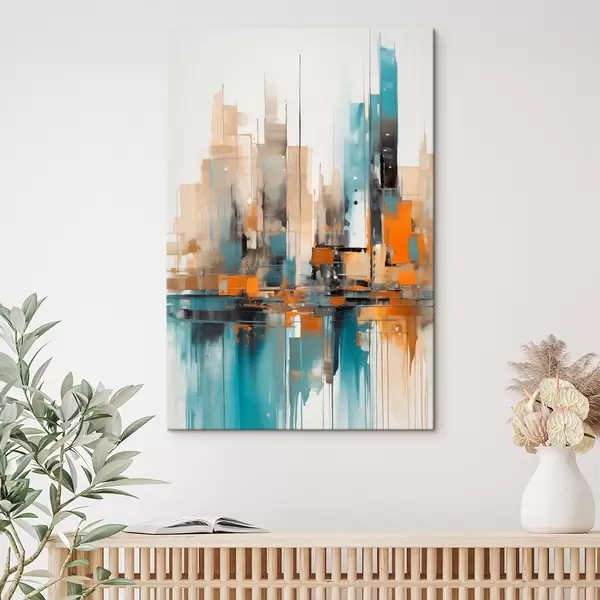 Maalid Abstraktne linnamaastik oranži, sinakasrohelise ja pruuni värvi vertikaalsete pintslitõmmetega ja geomeetriliste kujunditega Nr s46266