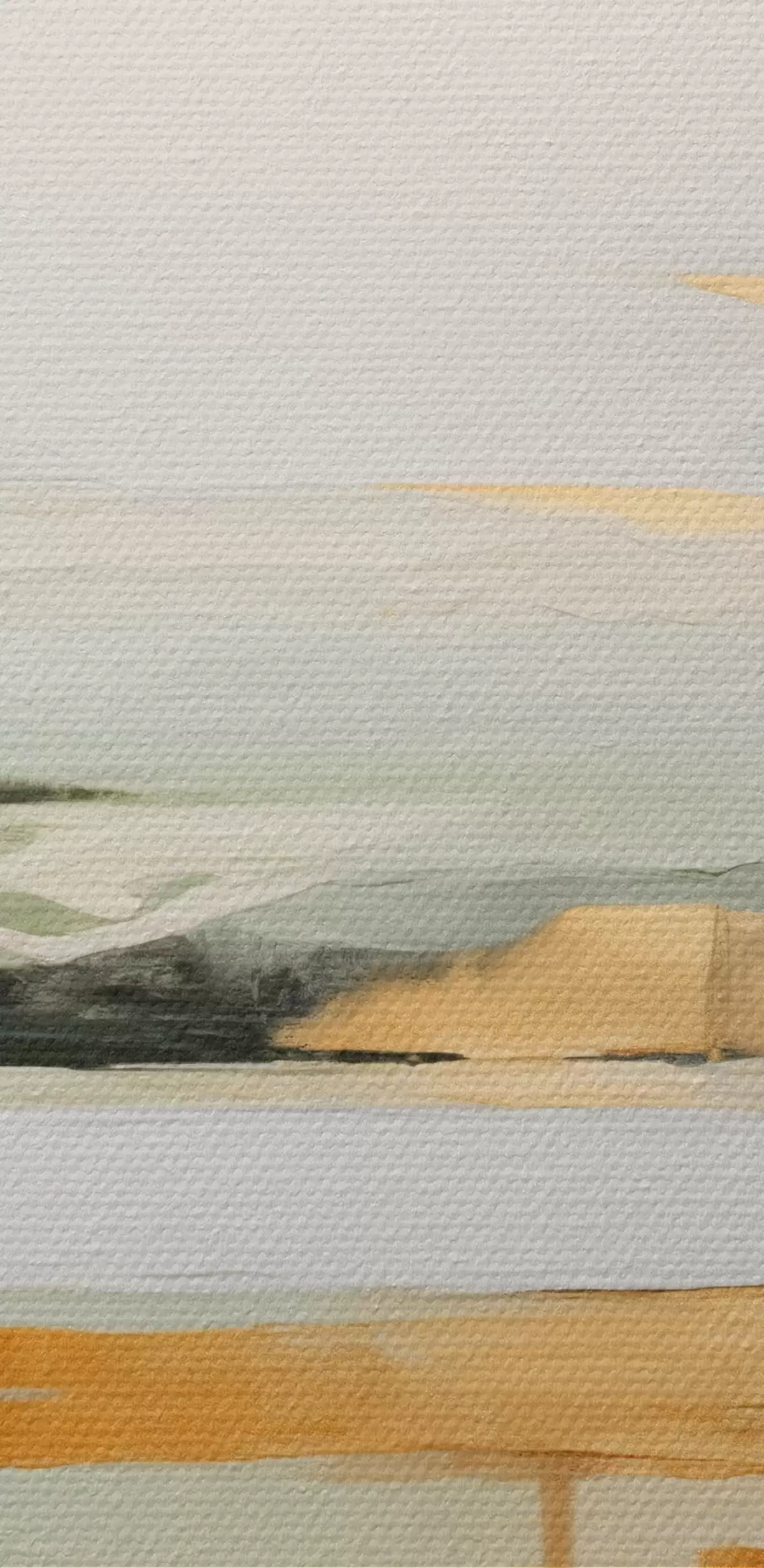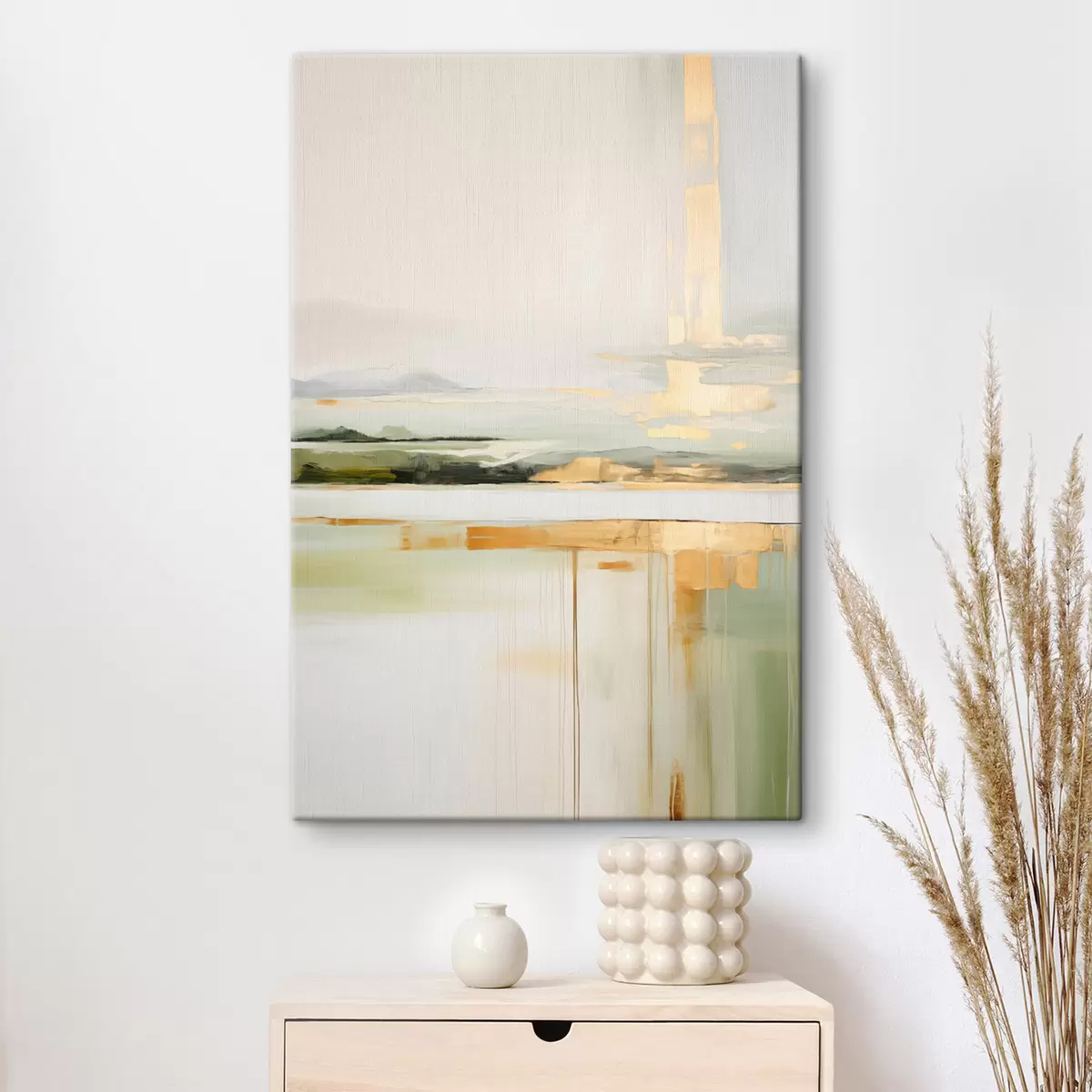 Maalid Abstraktne maastik kollaste aktsentidega, minimalistlik kompositsioon maast, veest ja taevast, vaoshoitud värvidega Nr s46268