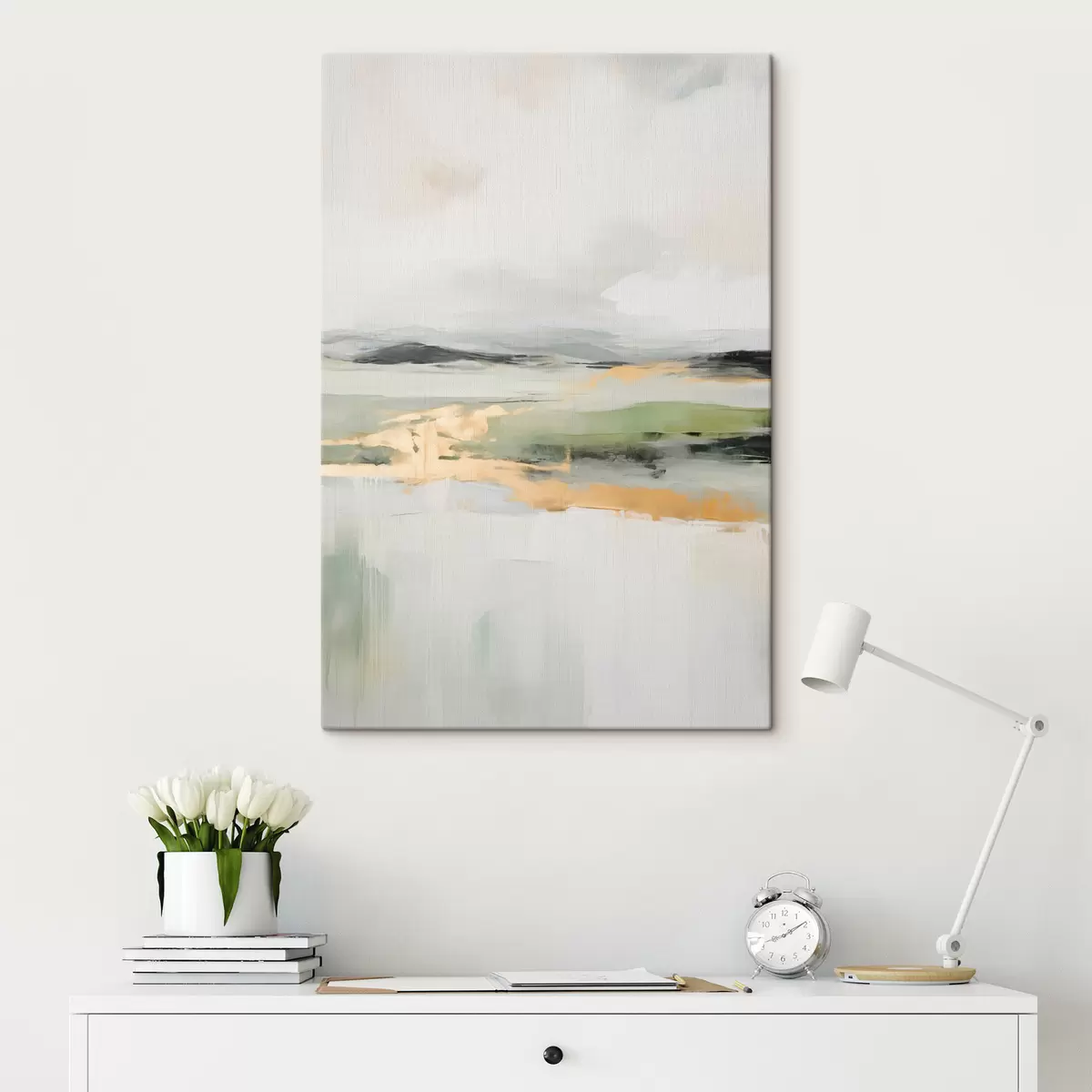 Maalid Abstraktne maastik kollaste aktsentidega, minimalistlik kompositsioon maast, veest ja taevast, vaoshoitud värvidega Nr s46269