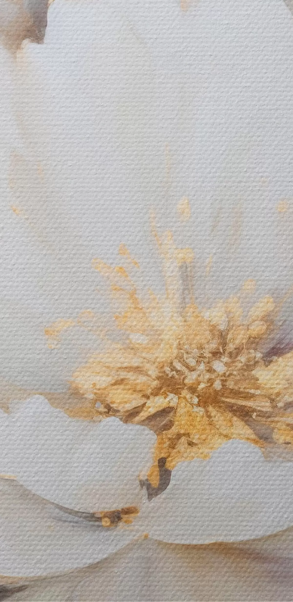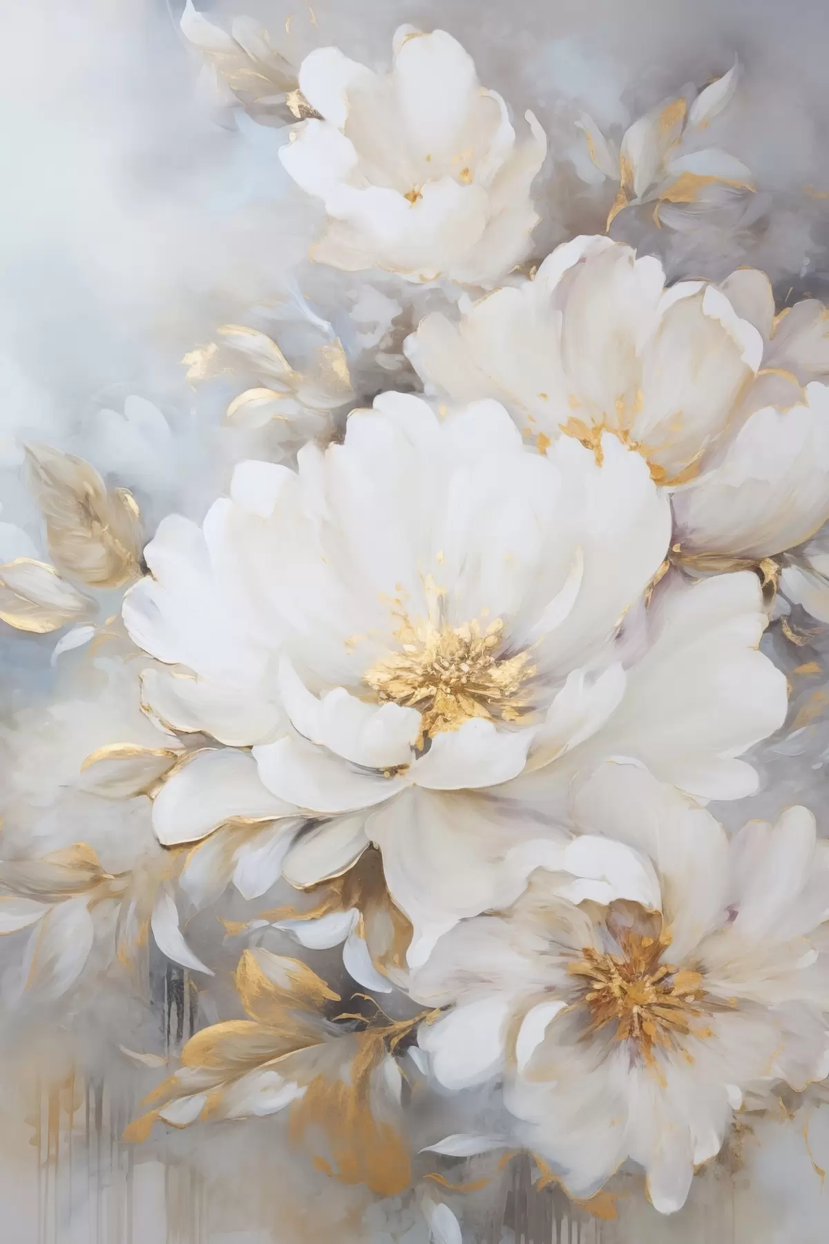 Maalid Valged pioonid kollase südamikuga ja lehtedega, pehmed pintslitõmbed, helesinine taust, lillekompositsioon Nr s46271