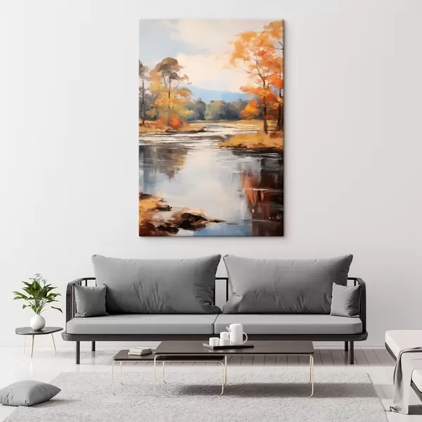 Maalid Maastik sügisel metsas voolava jõega, kollased ja oranžid puud, maalistiil Nr s46281