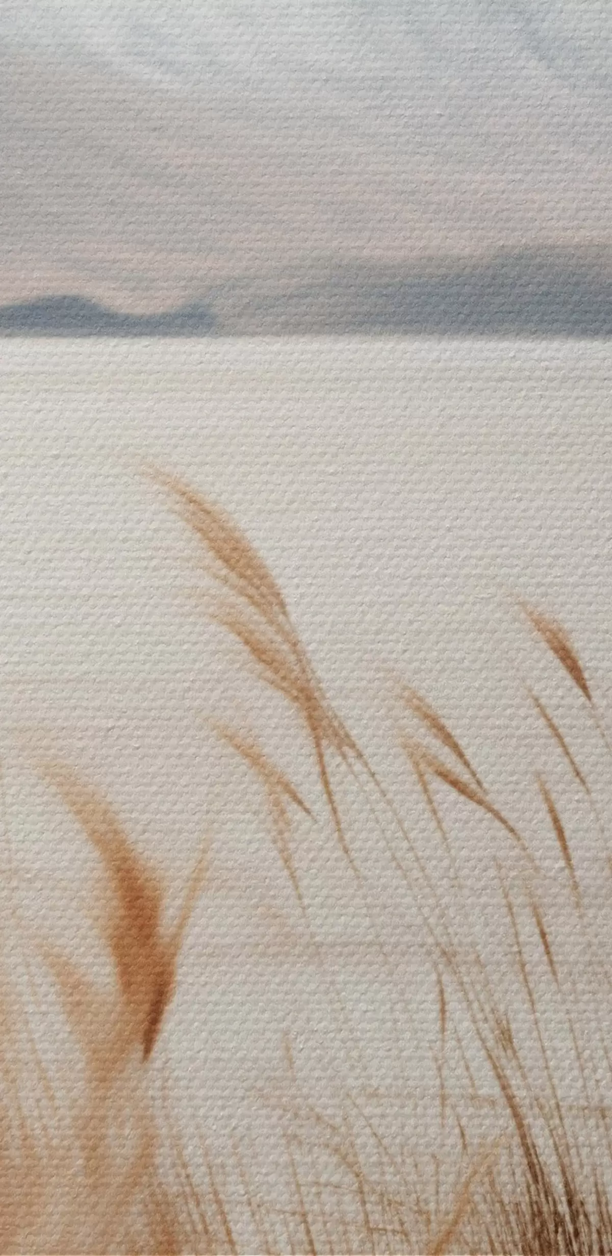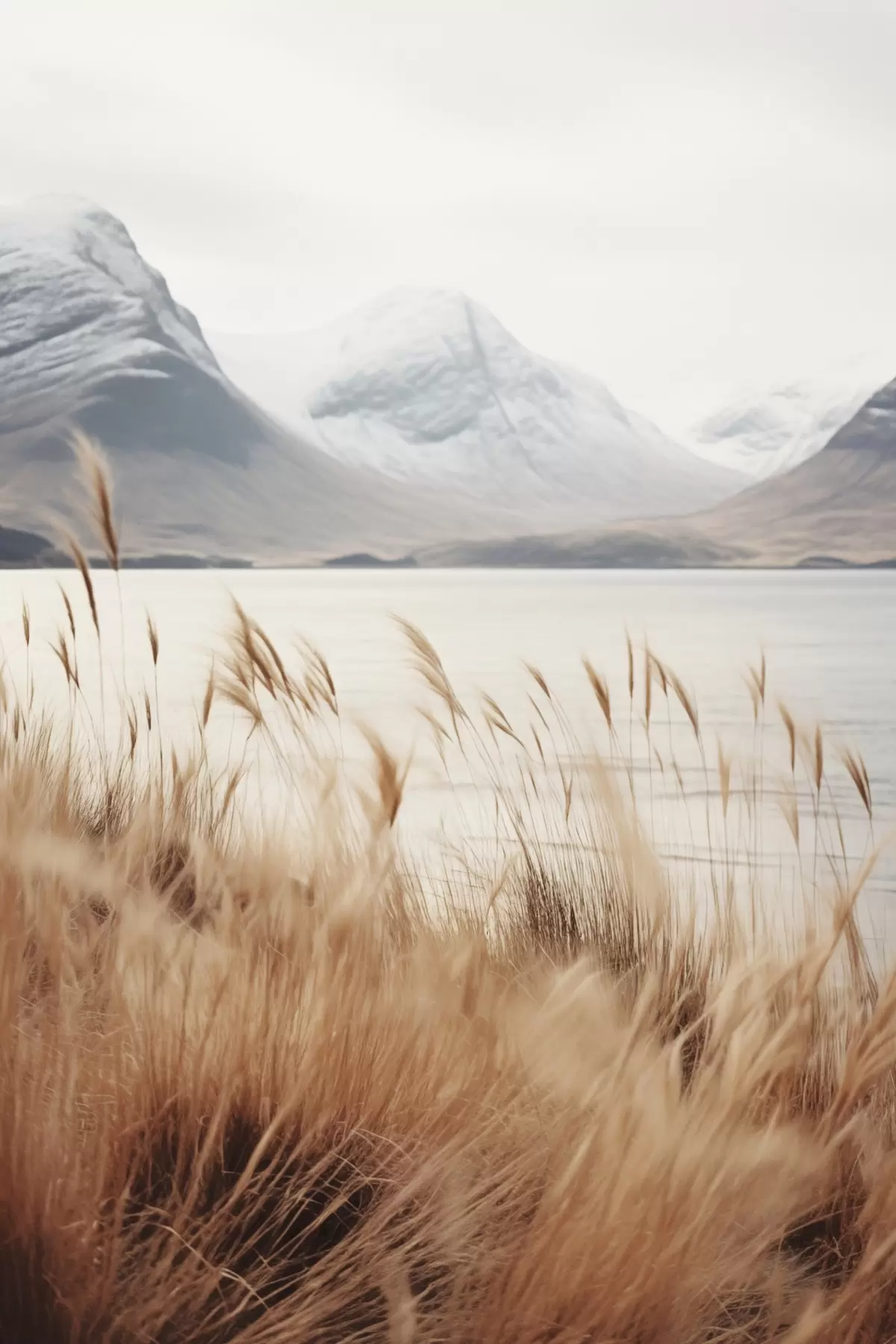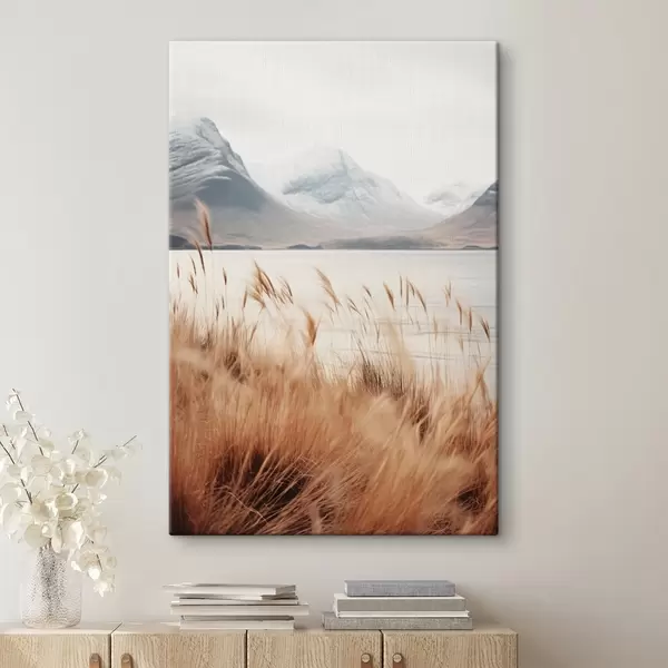 Maalid Pampasrohu väljak järve maastiku ees, taustal lumised mäed, pehme valgus Nr s46282