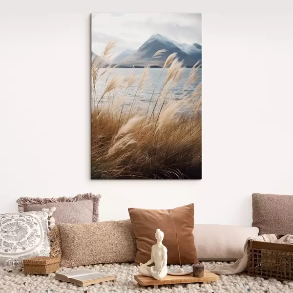 Maalid Pampasrohi järve ja mägede taustal, pehme valgustus, summutatud värvid, naturalistlik stiil Nr s46283