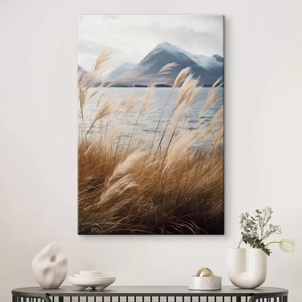Maalid Pampasrohi järve ja mägede taustal, pehme valgustus, summutatud värvid, naturalistlik stiil Nr s46283
