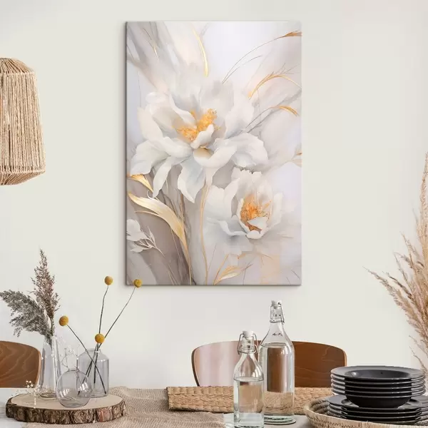 Maalid Valged õied kollaste emakate ja vartega, õrnad kroonlehed, elegantne kompositsioon, neutraalne taust Nr s46293