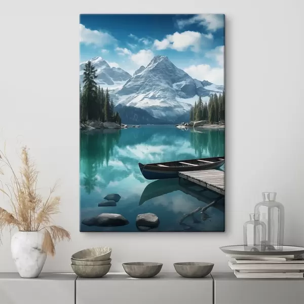 Maalid Alpi järv kanuuga ja lumiste mäetippudega Nr s46481