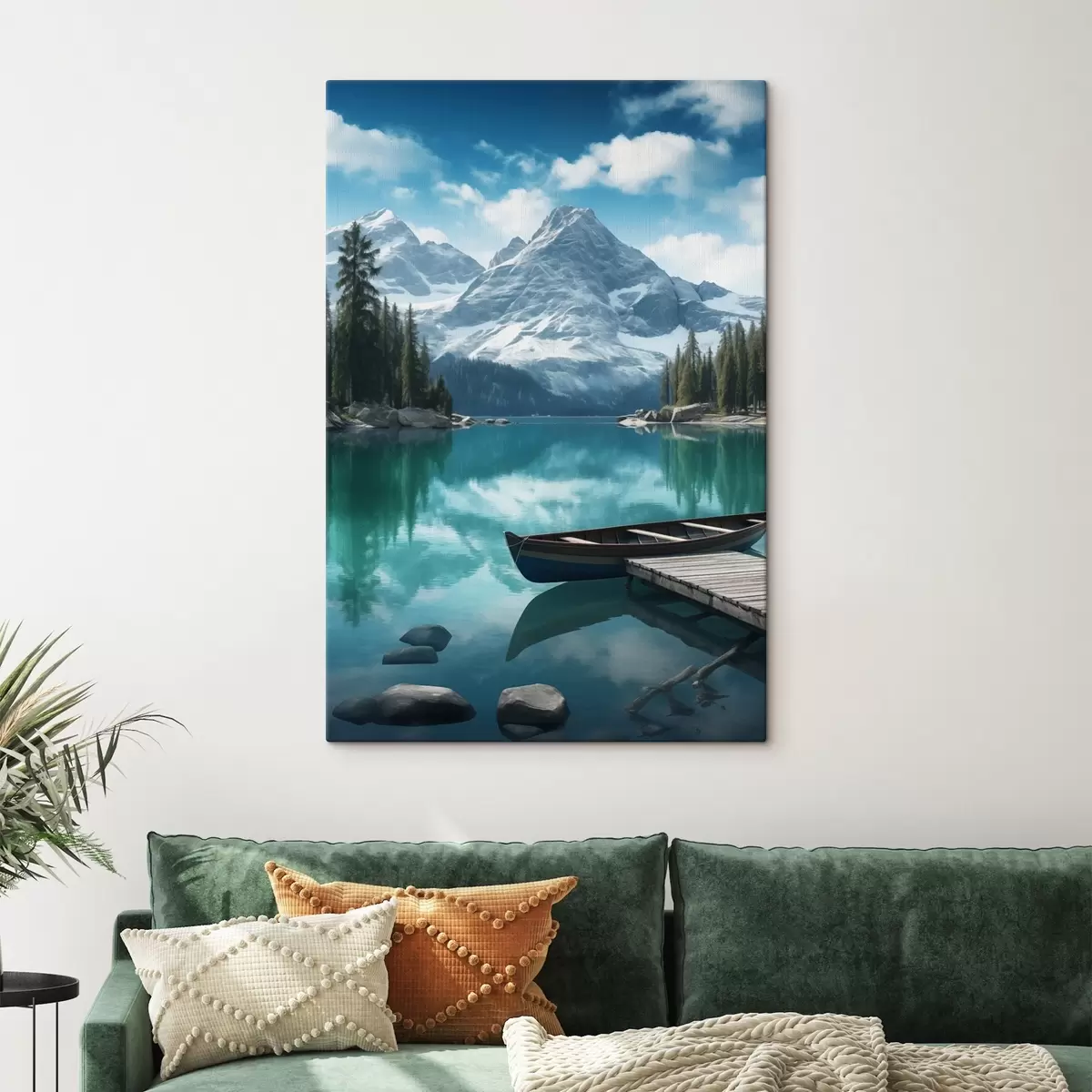 Maalid Alpi järv kanuuga ja lumiste mäetippudega Nr s46481