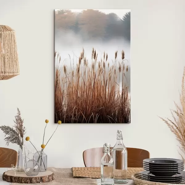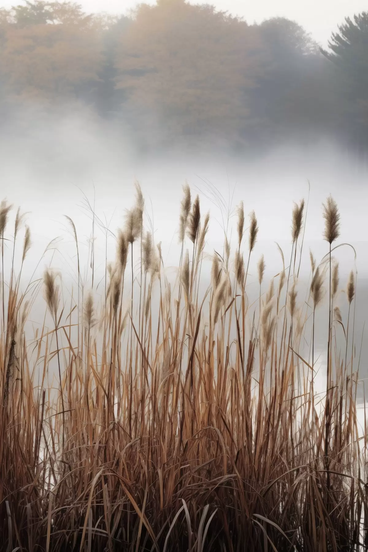 Maalid Veekogus kasvavad kõrged pillirood, vesi peegeldab pilliroogu, udune taust, pehme valgus, loodusvaade Nr s46696