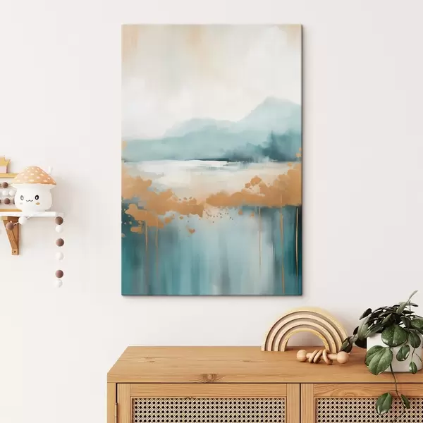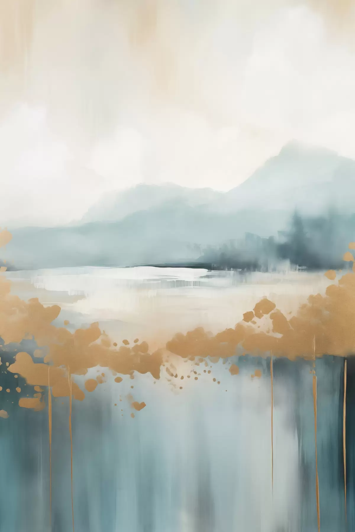 Maalid Abstraktne maastik mägedega ja järvega sinakasrohelises ja tekstuurse kollases toonis, pehmed pintslitõmbed, minimalistlik kunstiteos Nr s46703