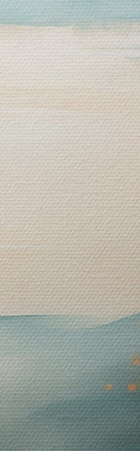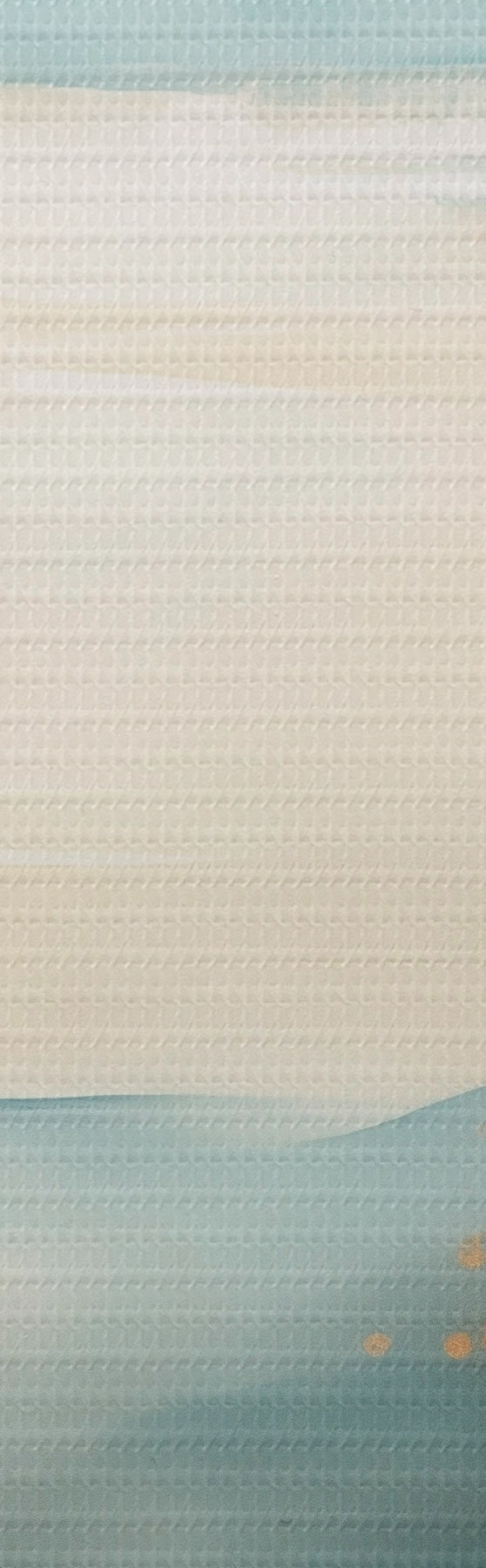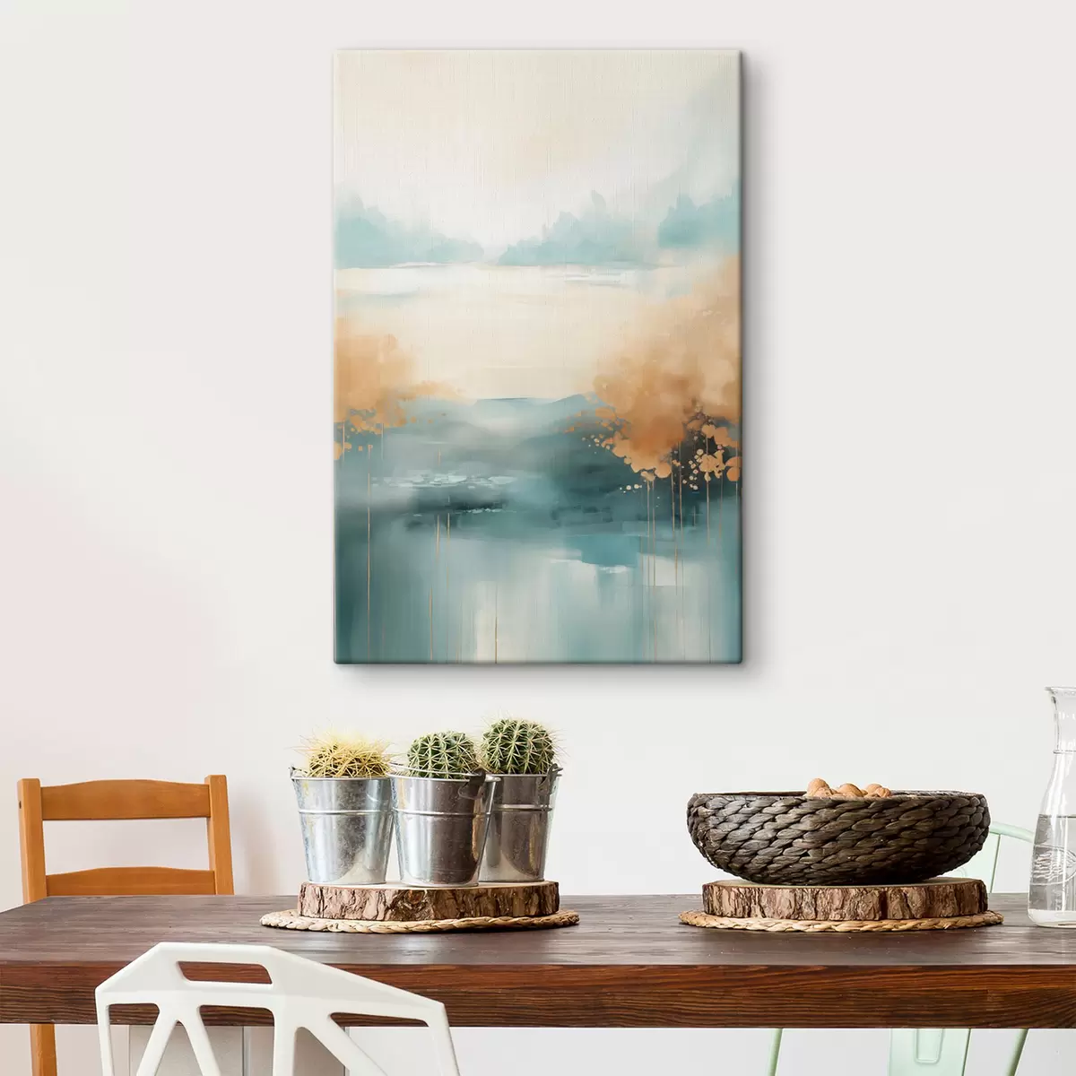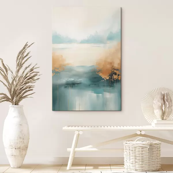 Maalid Abstraktne maastik mägedega ja järvega sinakasrohelises ja tekstuurse kollases toonis, pehmed pintslitõmbed, minimalistlik kunstiteos Nr s46704