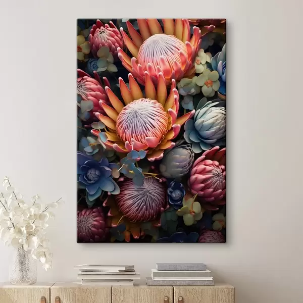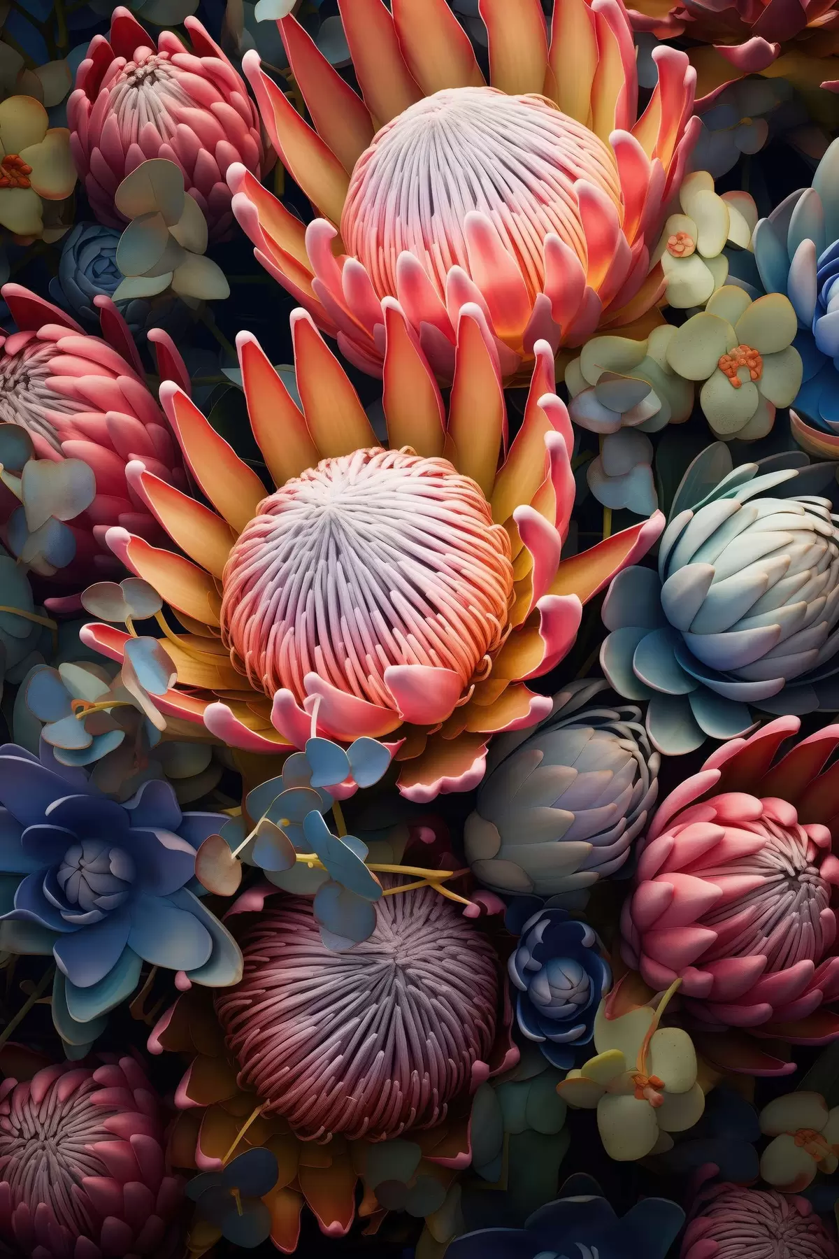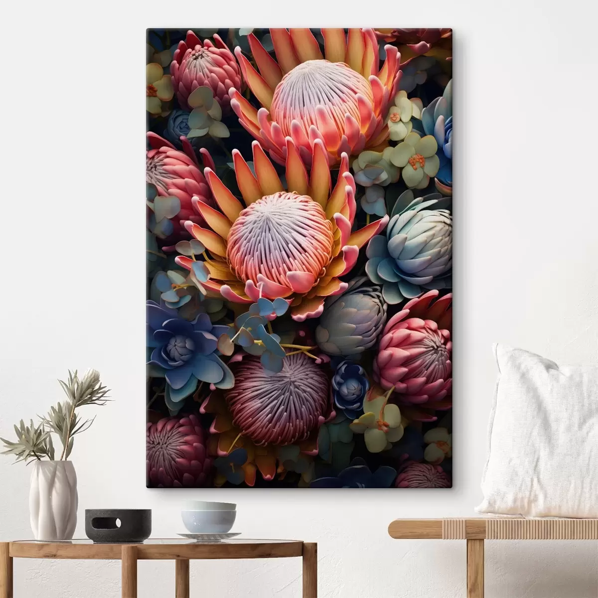 Maalid Proteaside, eukalüptide ja sukkulentide kompositsioon fotorealistlikus digitaalkunstistiilis Nr s46925