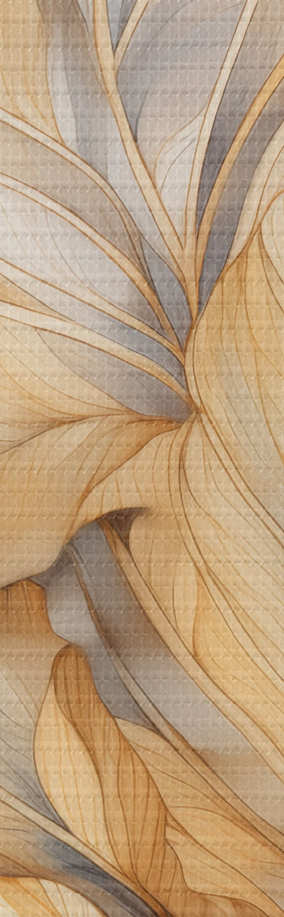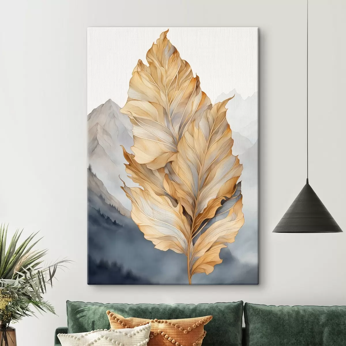 Maalid Abstraktsed suured, kollased ja pruunid lehed keeruliste detailidega, mäestiku taustal Nr s47022