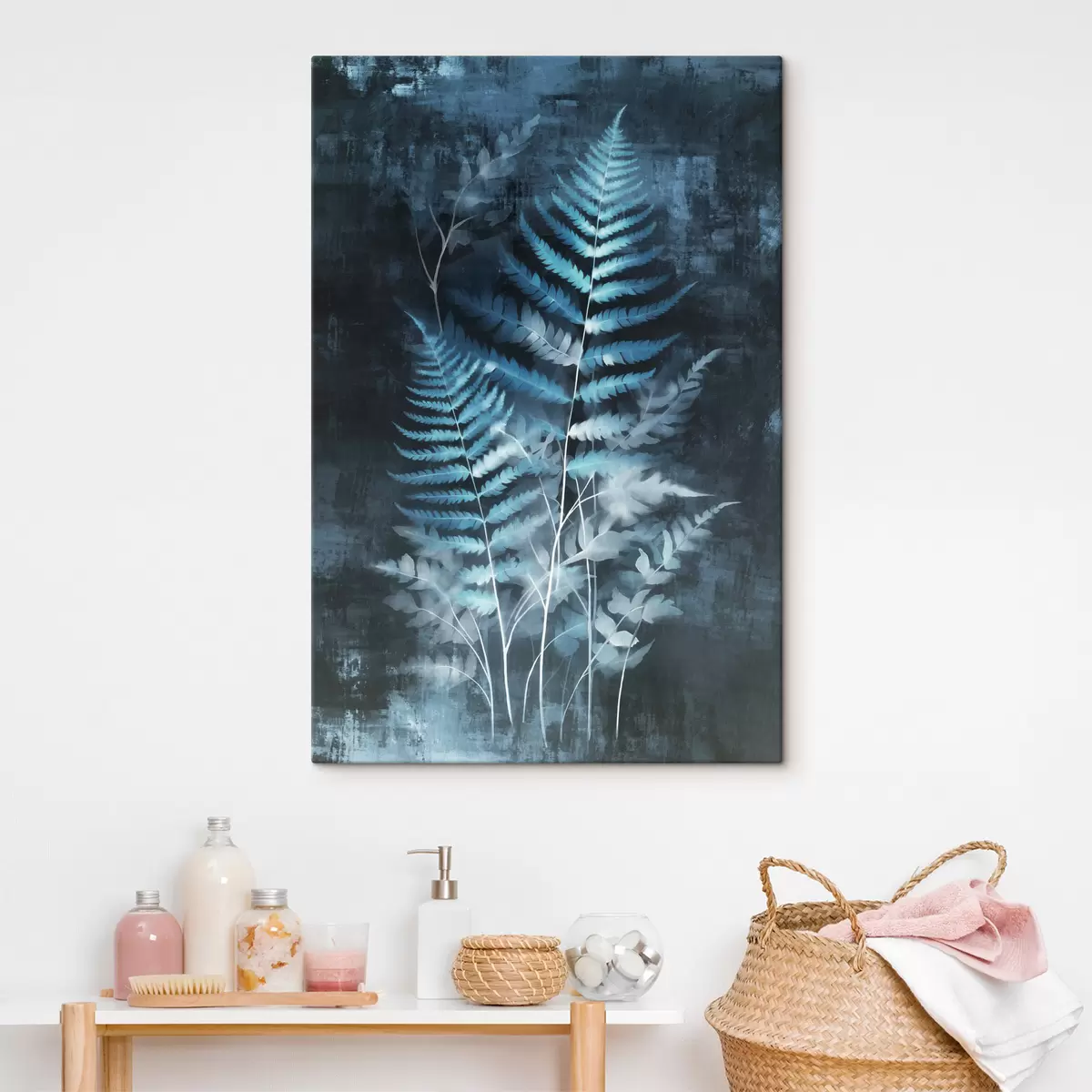 Maalid Sinised sõnajalad ja taimed tumedal, tekstuurse taustaga, rõhuasetusega keerulistel detailidel, röntgeniefekt Nr s47026