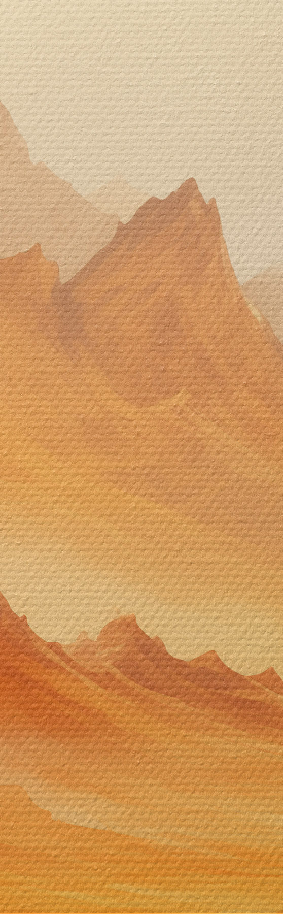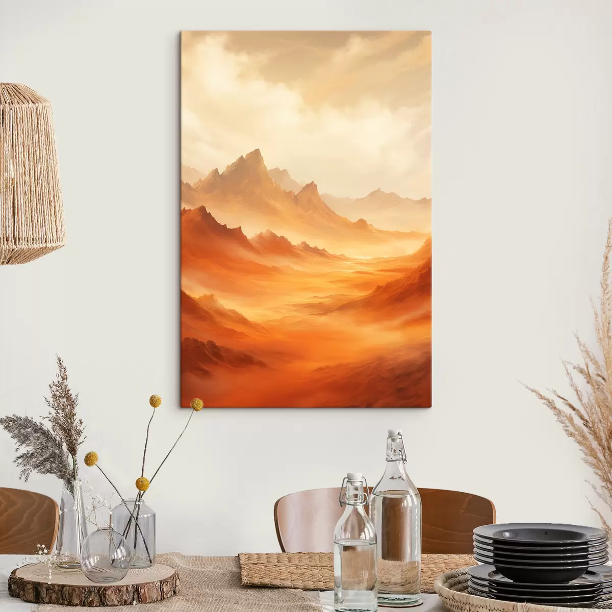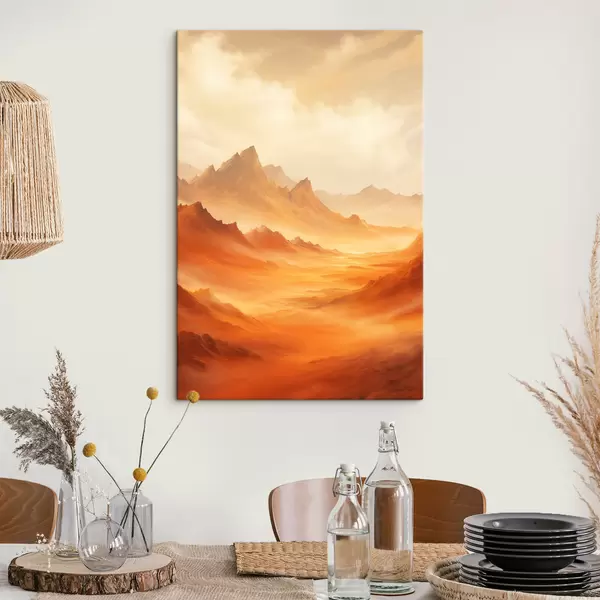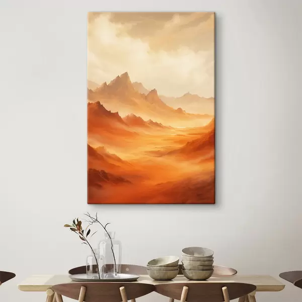 Maalid Lai oranž kõrbe maastik, kus kõrguvad kaljused mäed uduse, päikesepaistelise taeva all, millel on õhukesed pilved. Nr s47029