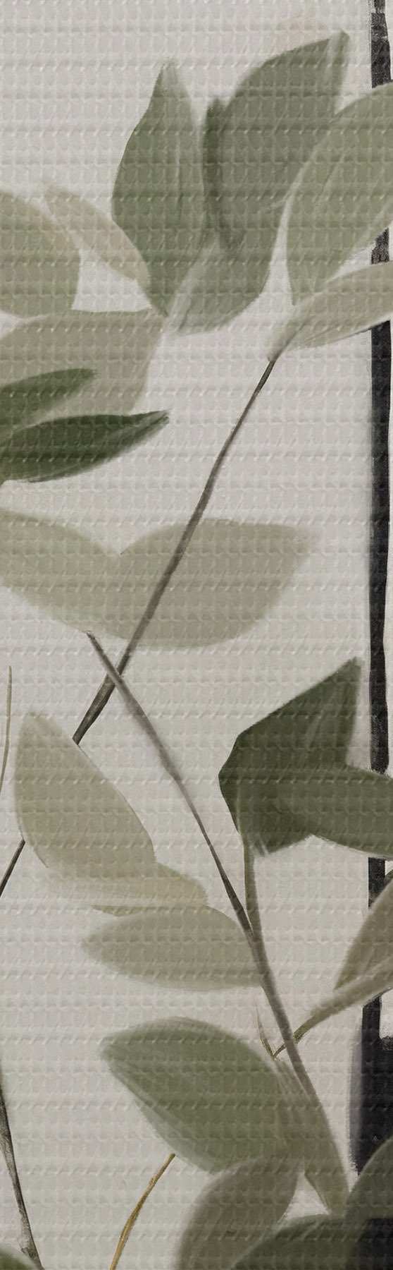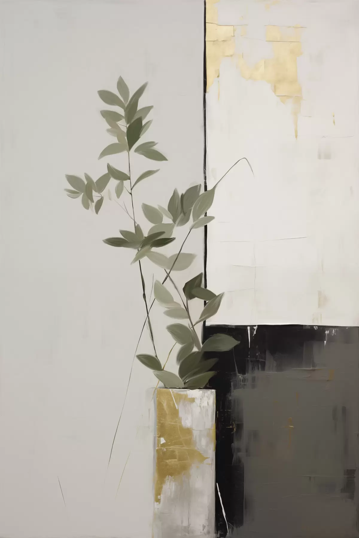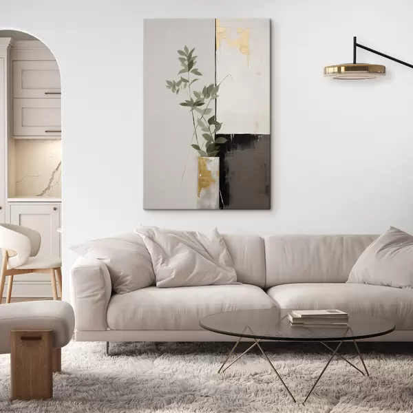 Maalid Minimalistlik tekstuuriga maal, millel on kujutatud vaas roheliste lehtedega abstraktsete geomeetriliste kujundite taustal. Nr s47036