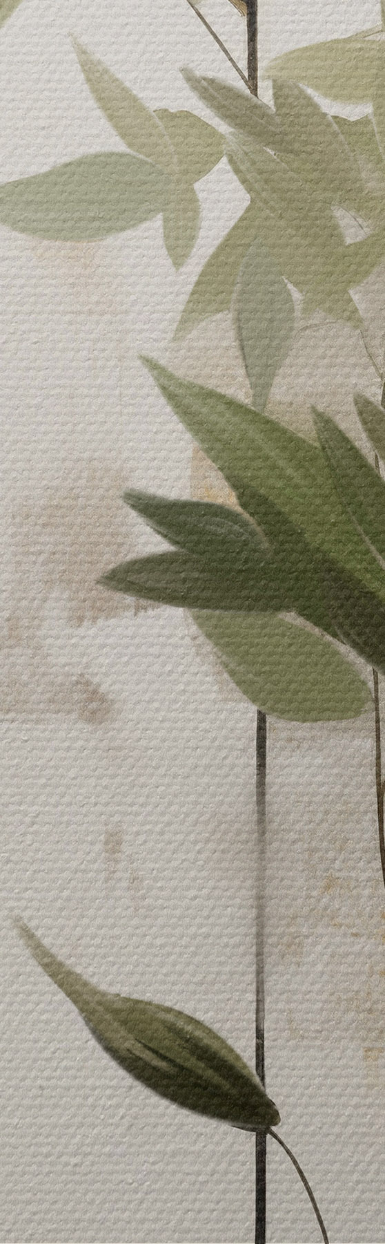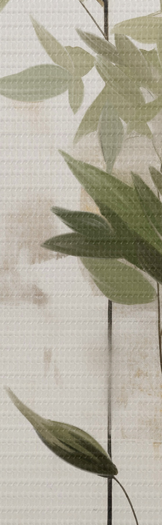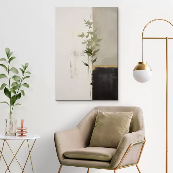 Maalid Minimalistlik tekstuuriga maal, millel on kujutatud vaas roheliste lehtedega abstraktsete geomeetriliste kujundite taustal. Nr s47037
