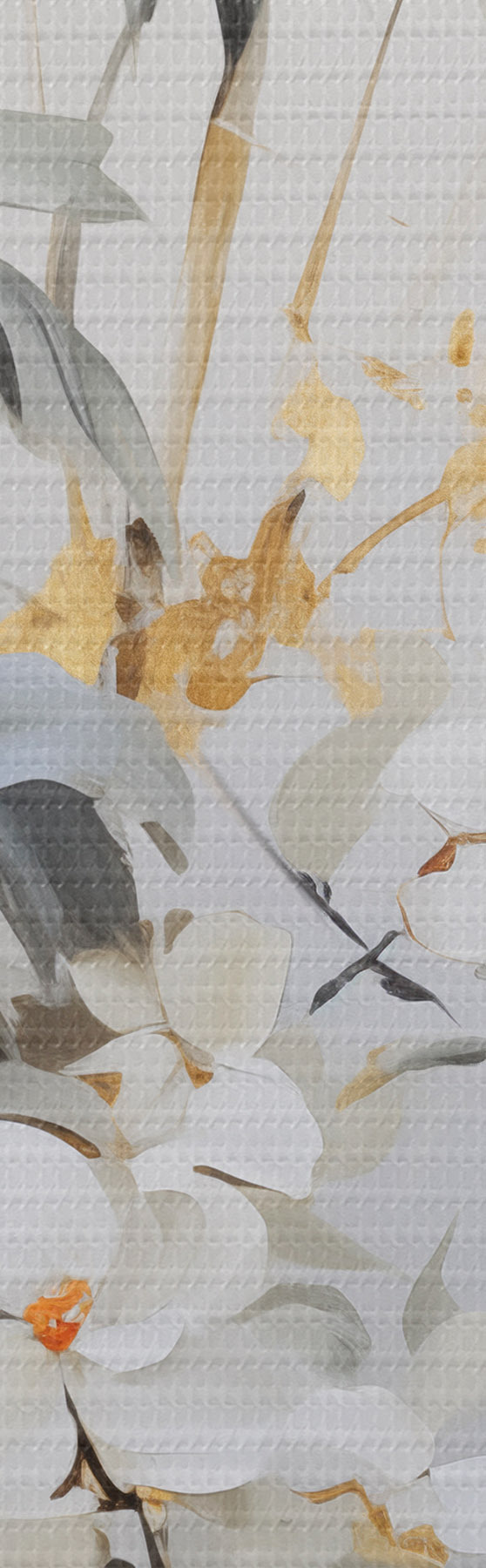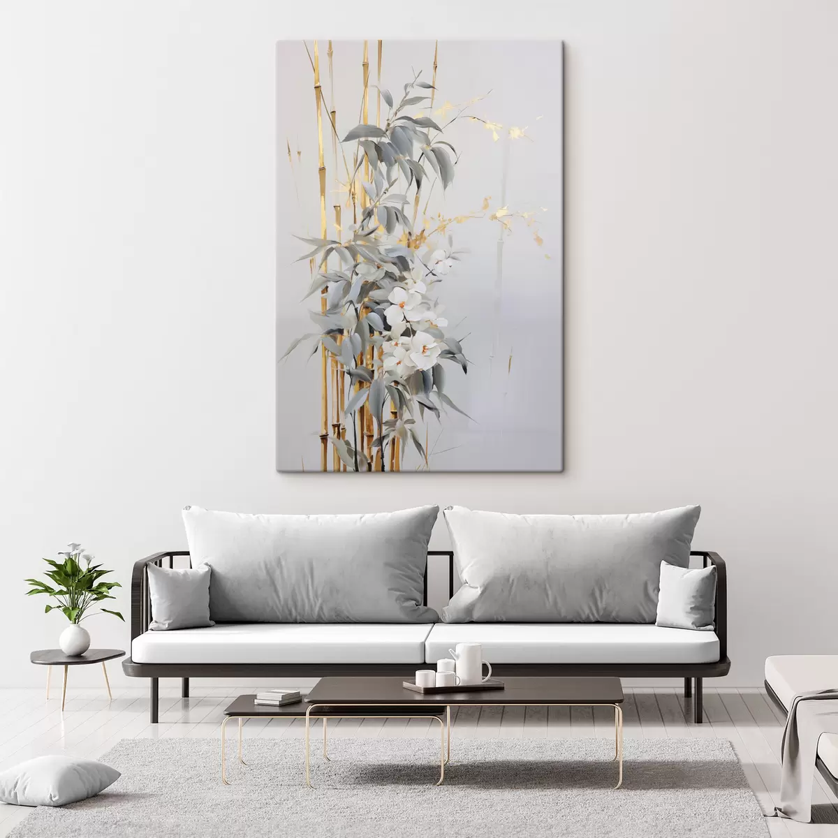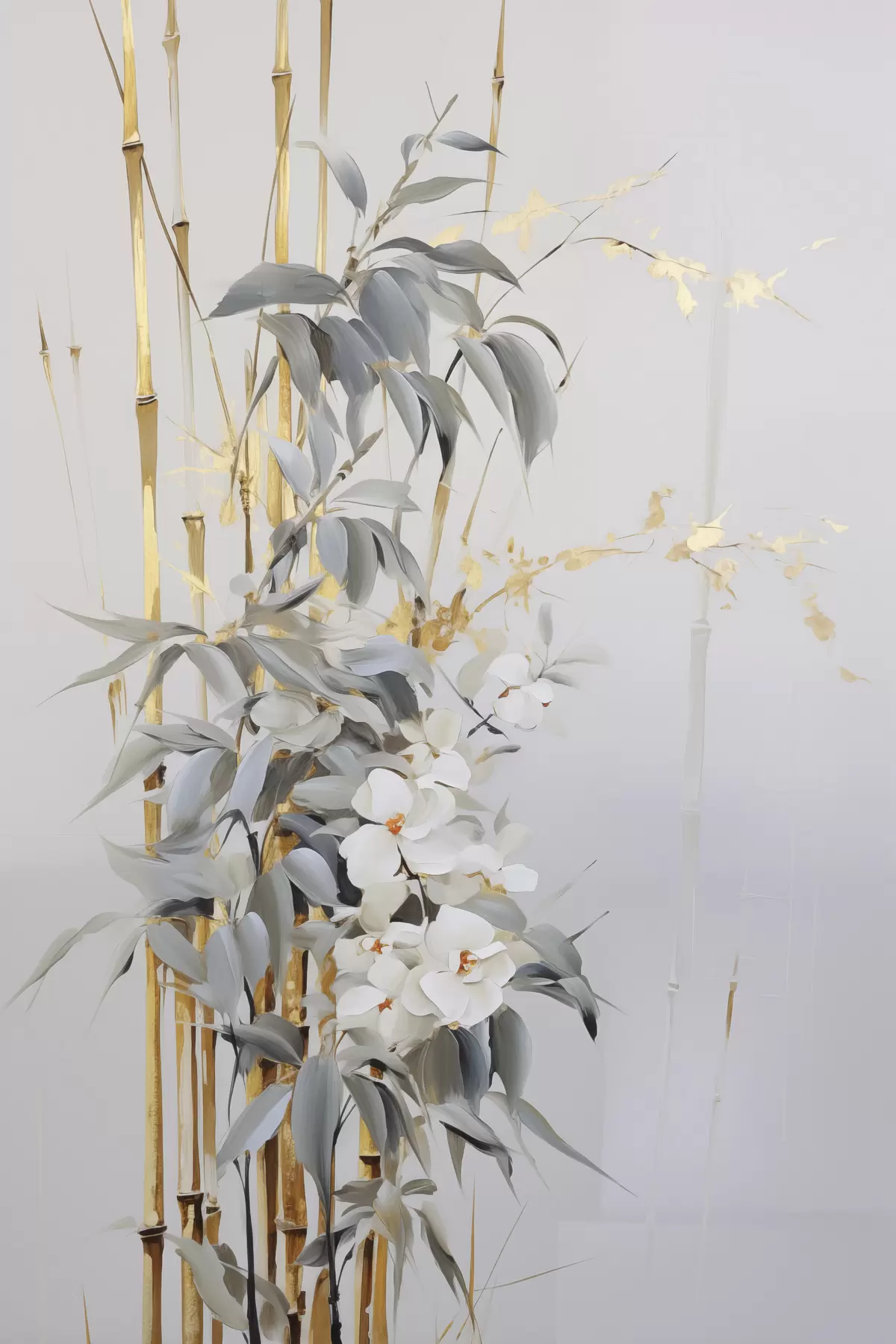 Maalid Abstraktsed bambusevarred kollaste aktsentidega, õrnad valged õied ja helerohelised lehed, hall taust Nr s47038