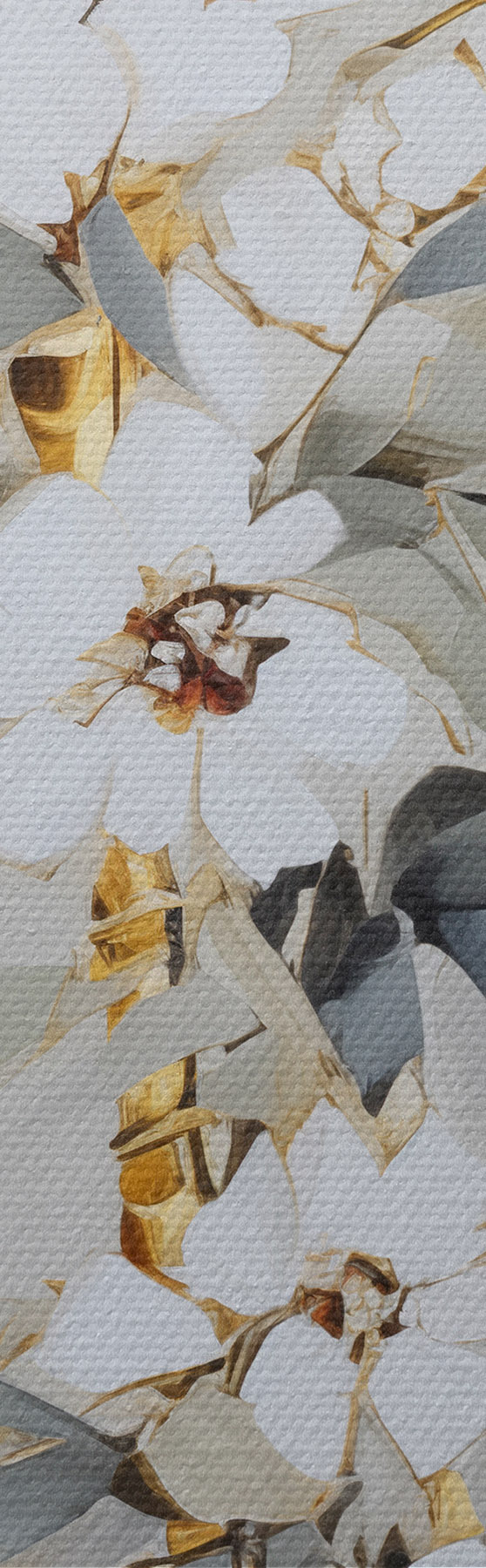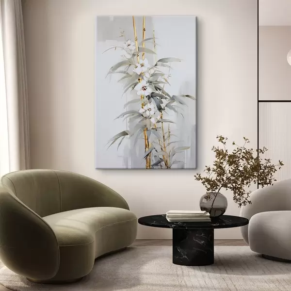 Maalid Abstraktsed bambusevarred kollaste aktsentidega, õrnad valged õied ja helerohelised lehed, hall taust Nr s47039