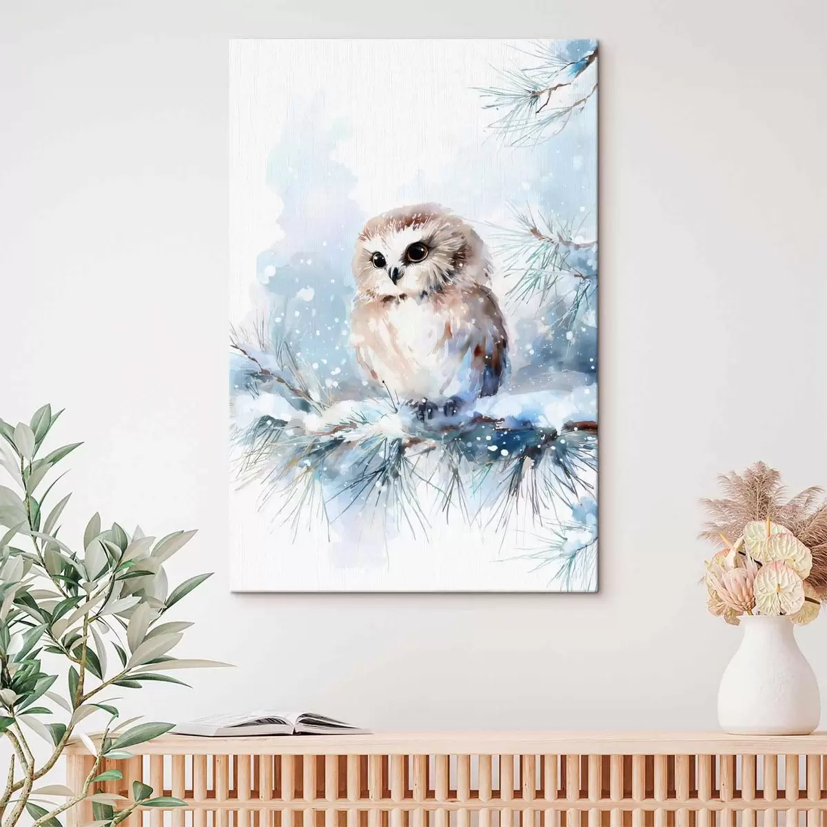 Maalid akvarellistiilis armas öökull lumega kaetud männipuu oksal Nr s47115