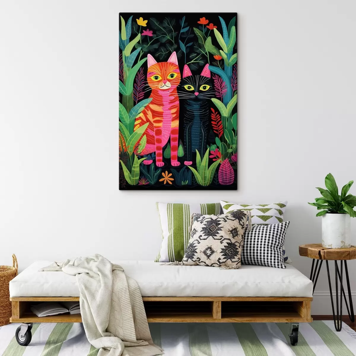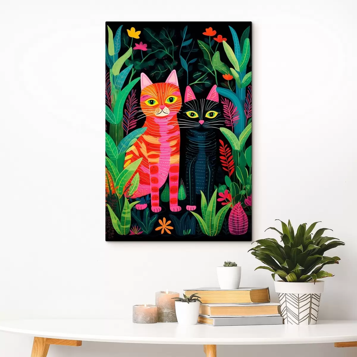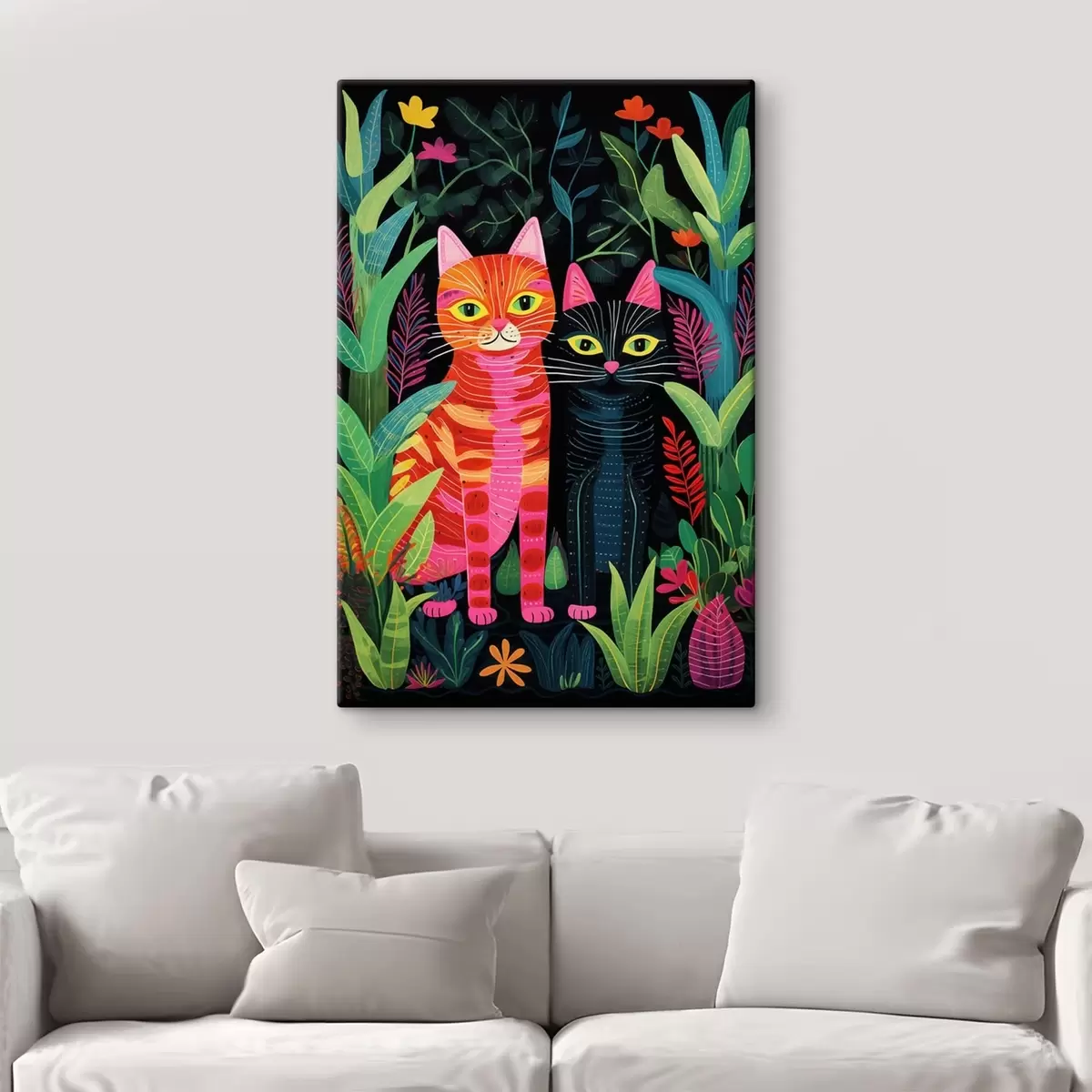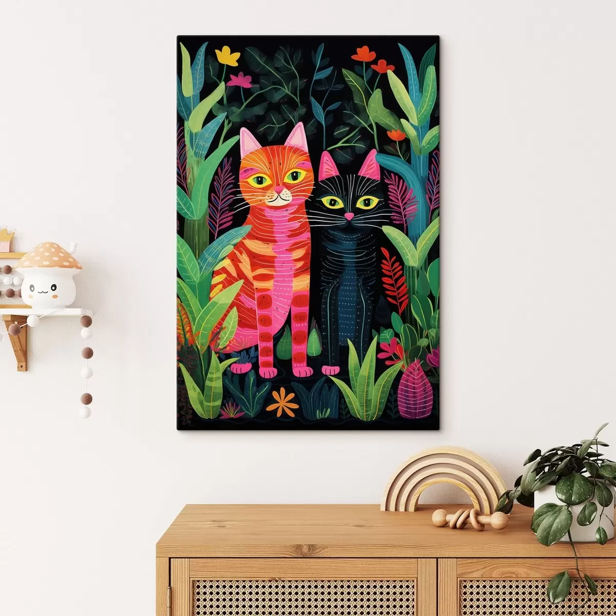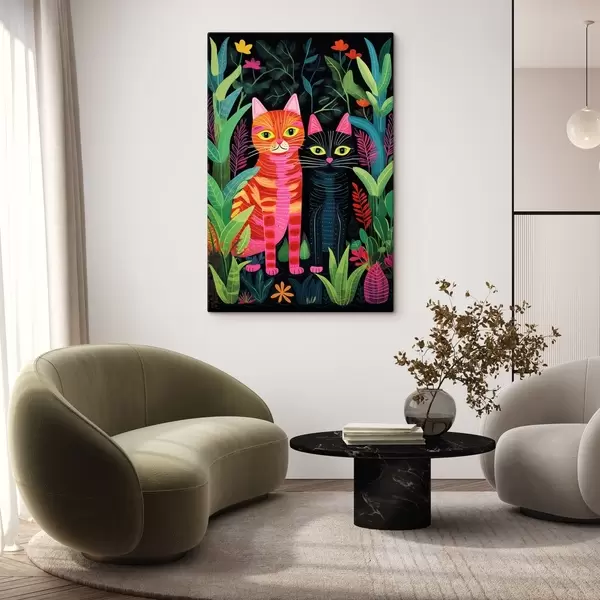 Maalid Kaks stiliseeritud kassi erksavärviliste taimede seas Nr s47298