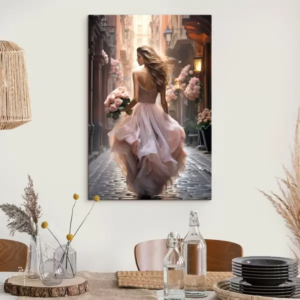 Maalid Roosas kleidis naine kõnnib mööda tänavat Nr s47316