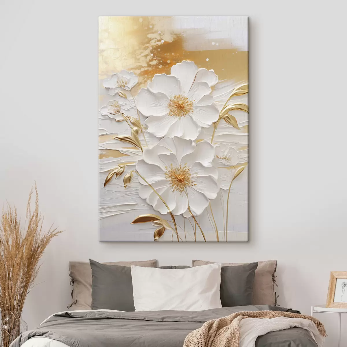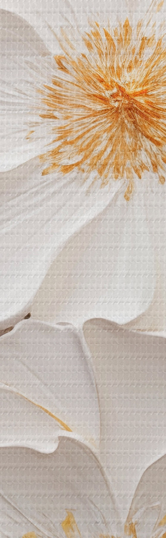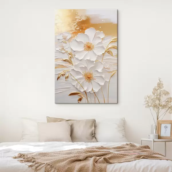 Maalid Valged lilled kollaste aksentidega ja õrnad lehed tekstuurse taustaga, modernne kunst Nr s47415