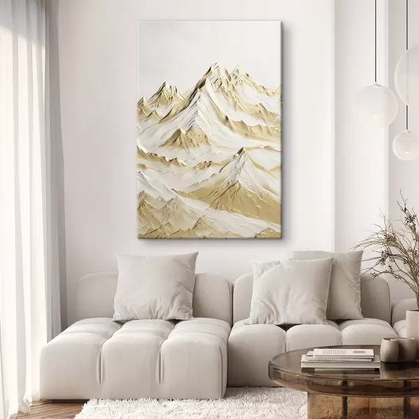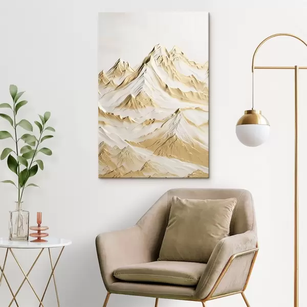 Maalid Kollane maastik, lumiste mäetippude ja sügavate orgudega heleda taeva all Nr s47420