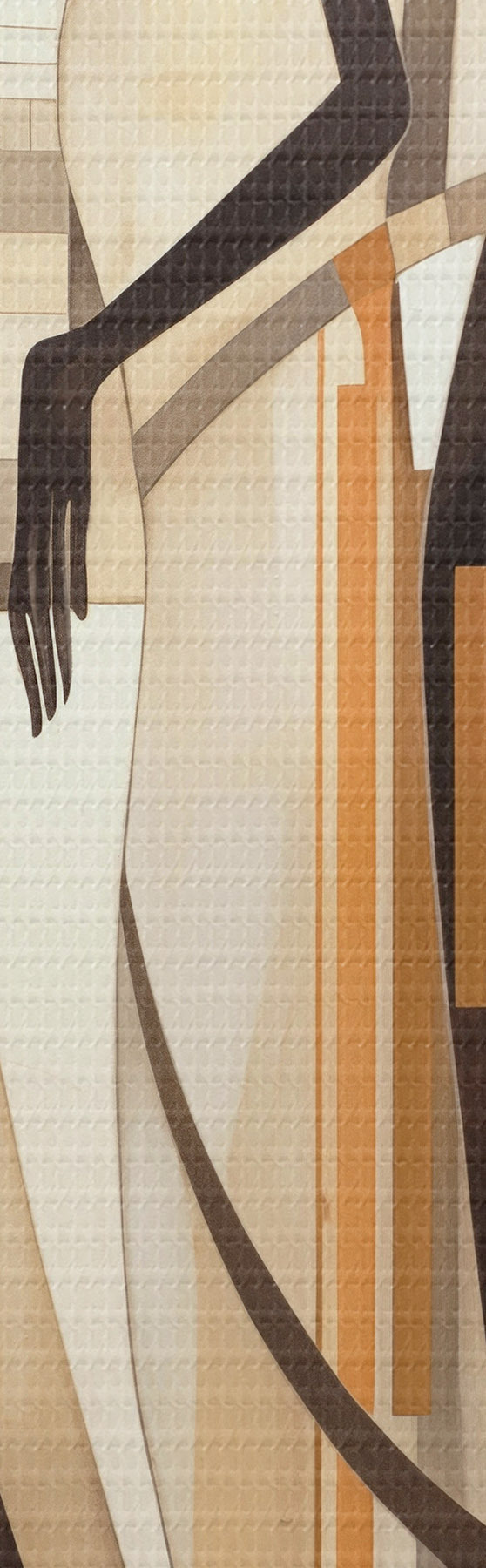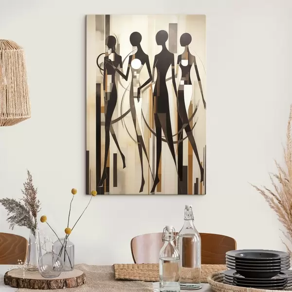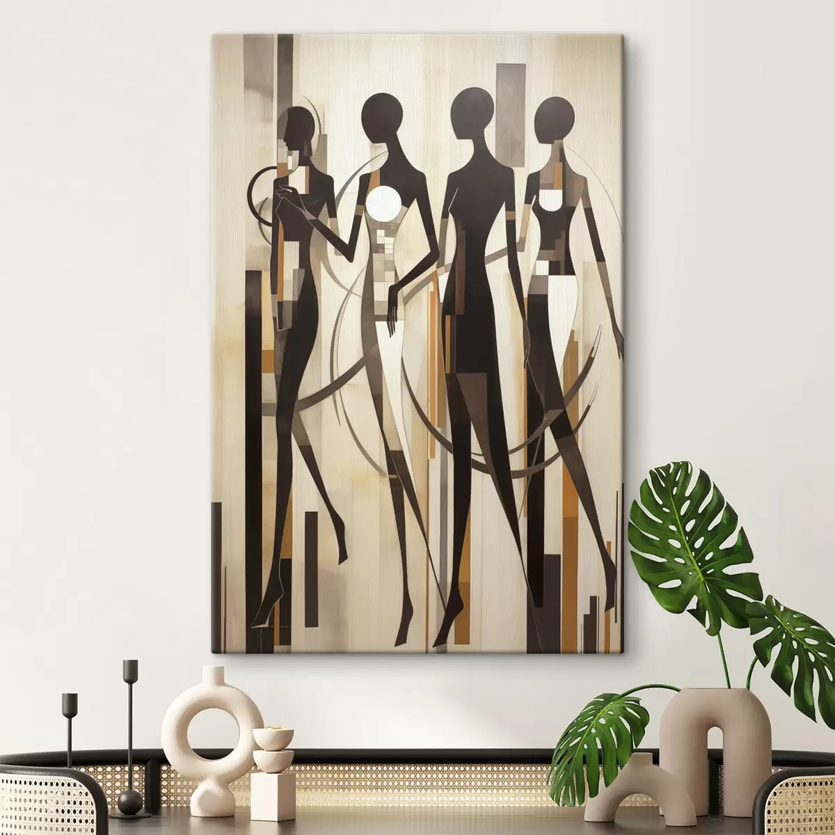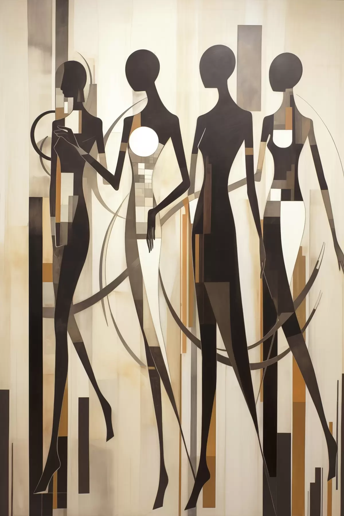 Maalid Stiliseeritud naisfiguurid geomeetriliste elementidega vertikaalsete joonte abstraktsel taustal Nr s47423