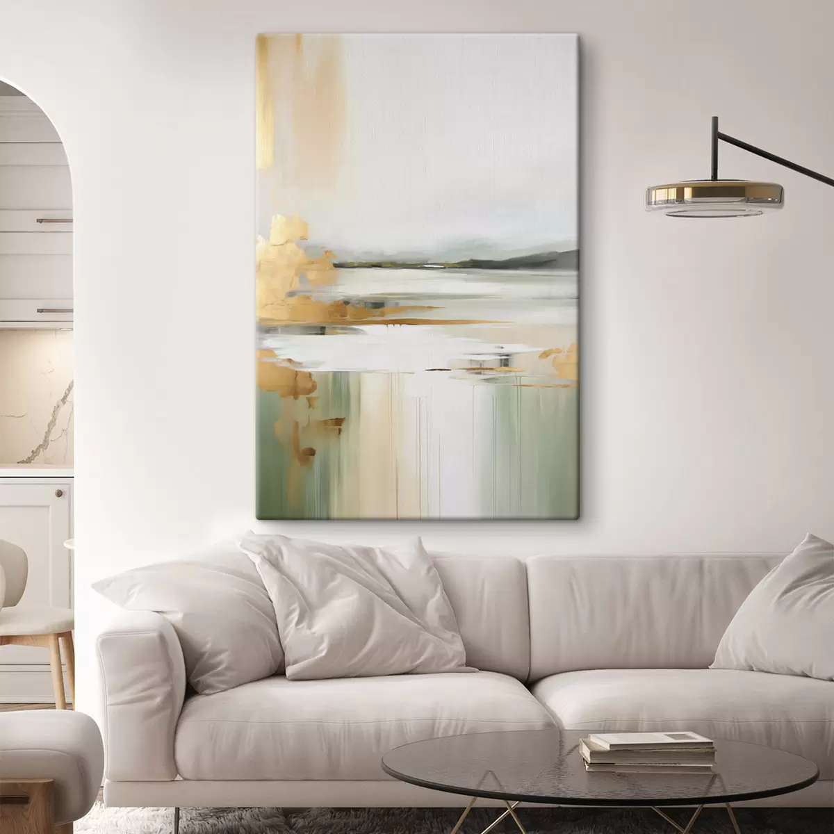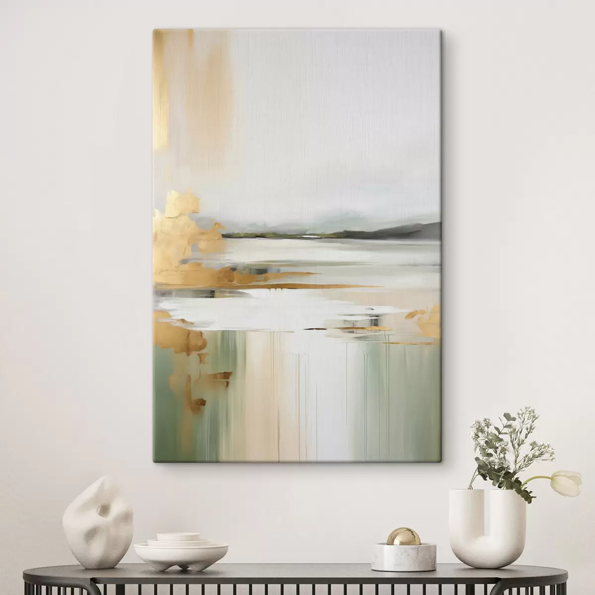 Maalid Abstraktne maastik kollaste ja roheliste toonidega, vesi peegeldab taevast ja kauguses asuvaid mägesid, kahvatu, udune taevas Nr s47438