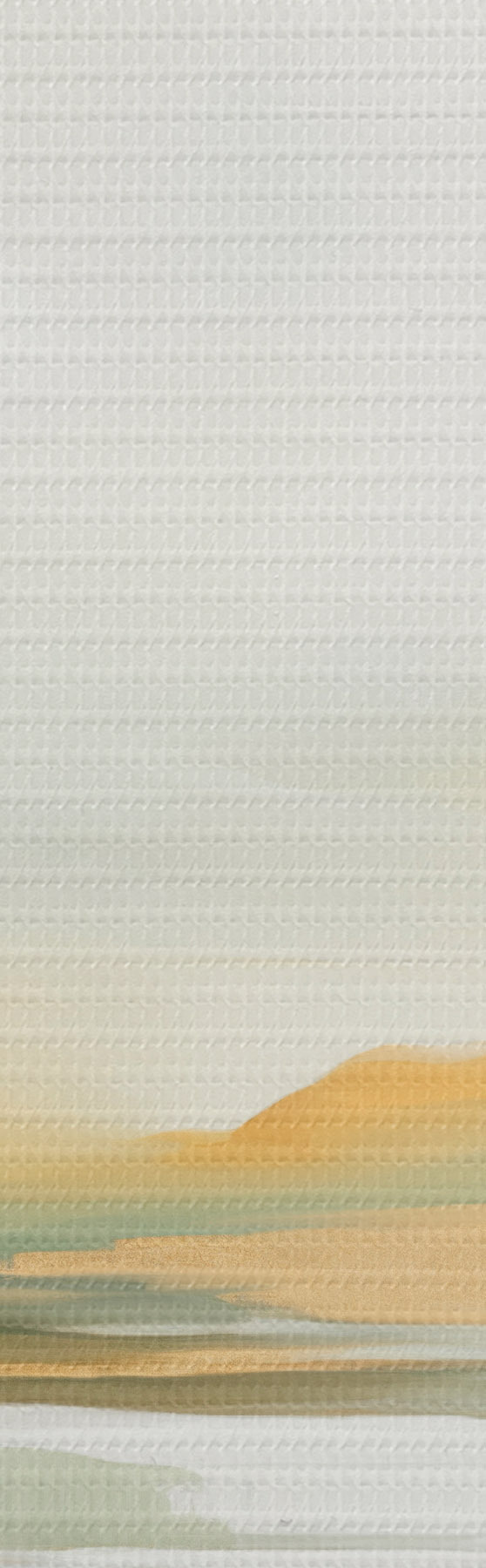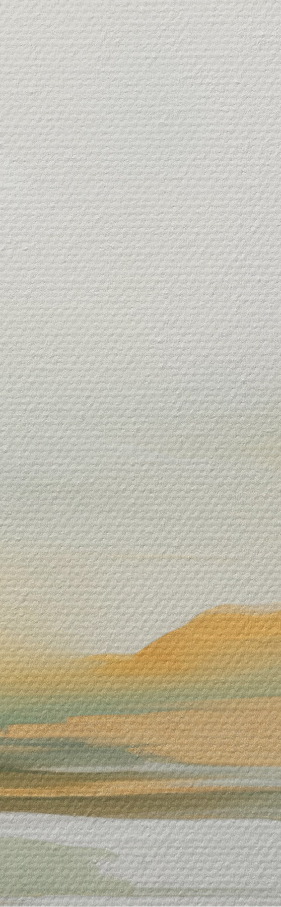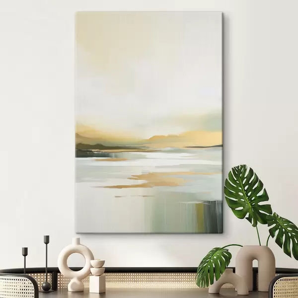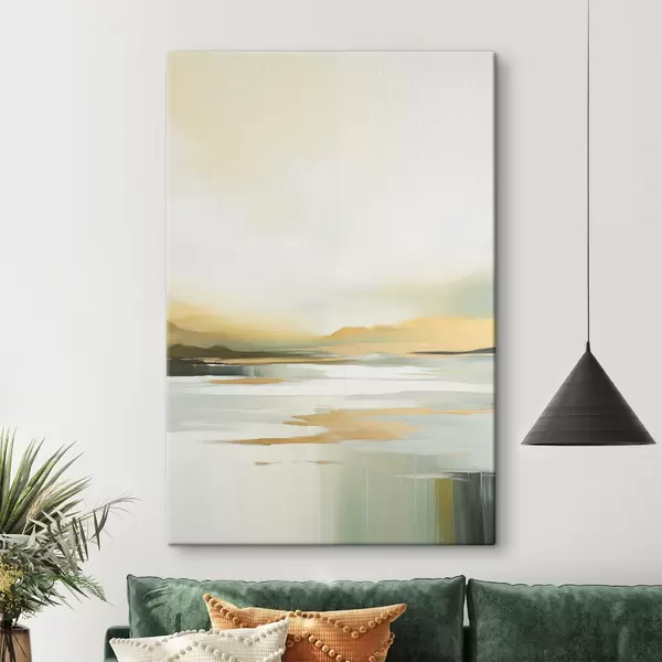Maalid Abstraktne maastik kollaste ja roheliste toonidega, vesi peegeldab taevast ja kauguses asuvaid mägesid, kahvatu, udune taevas Nr s47439