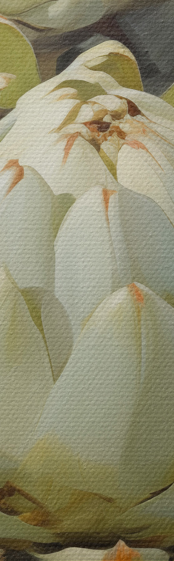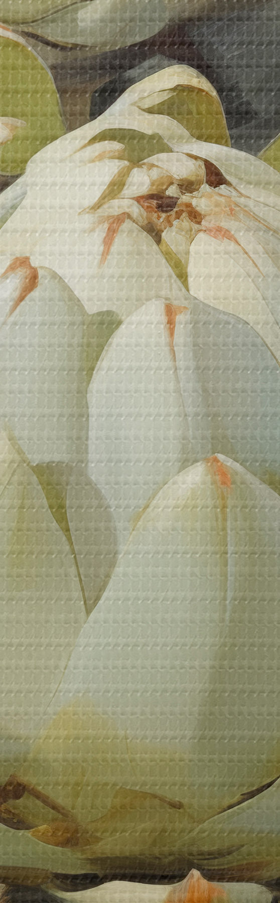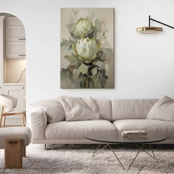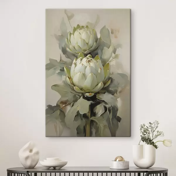 Maalid Maalistiil, milles on kujutatud mitu valget protea-lille suurete roheliste lehtedega heledal taustal. Nr s47862