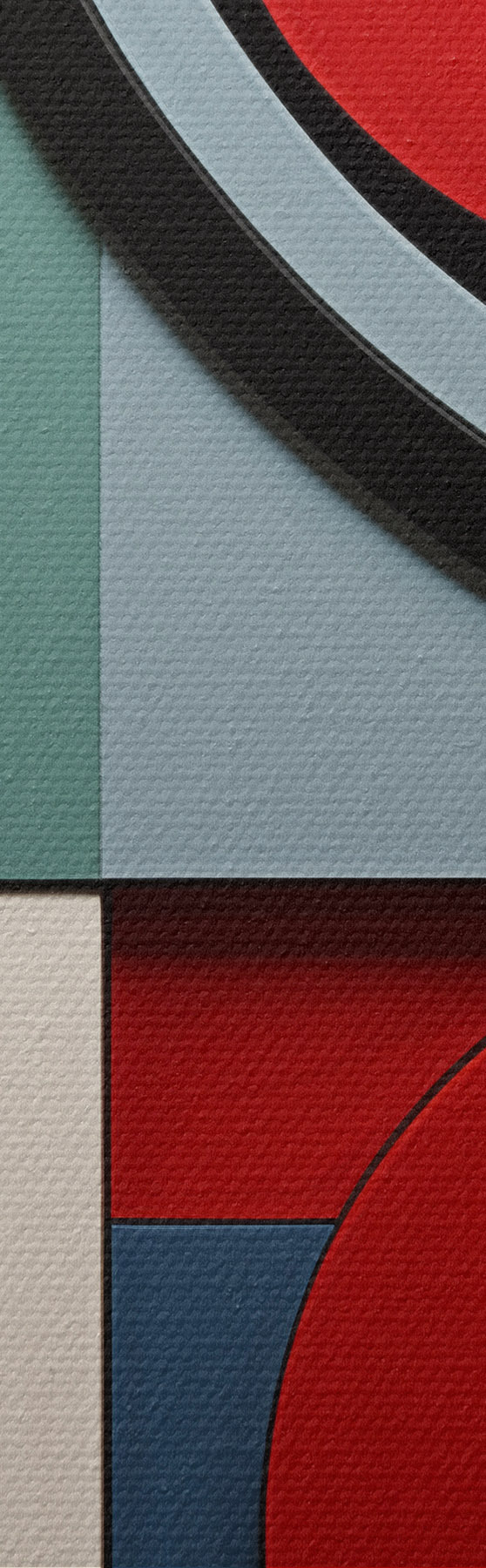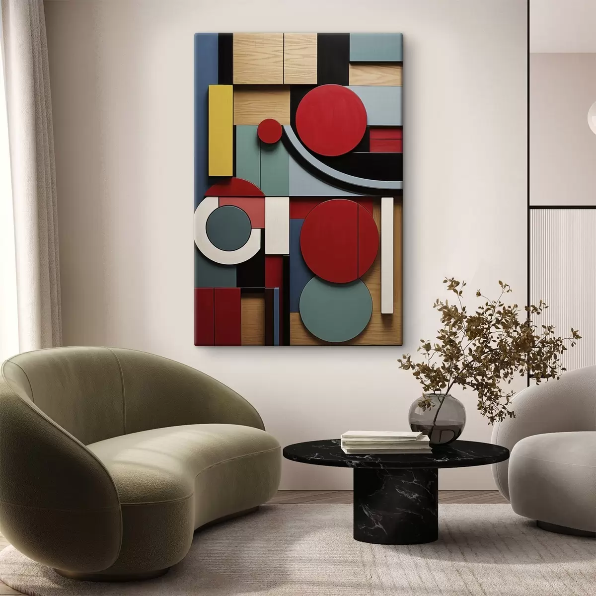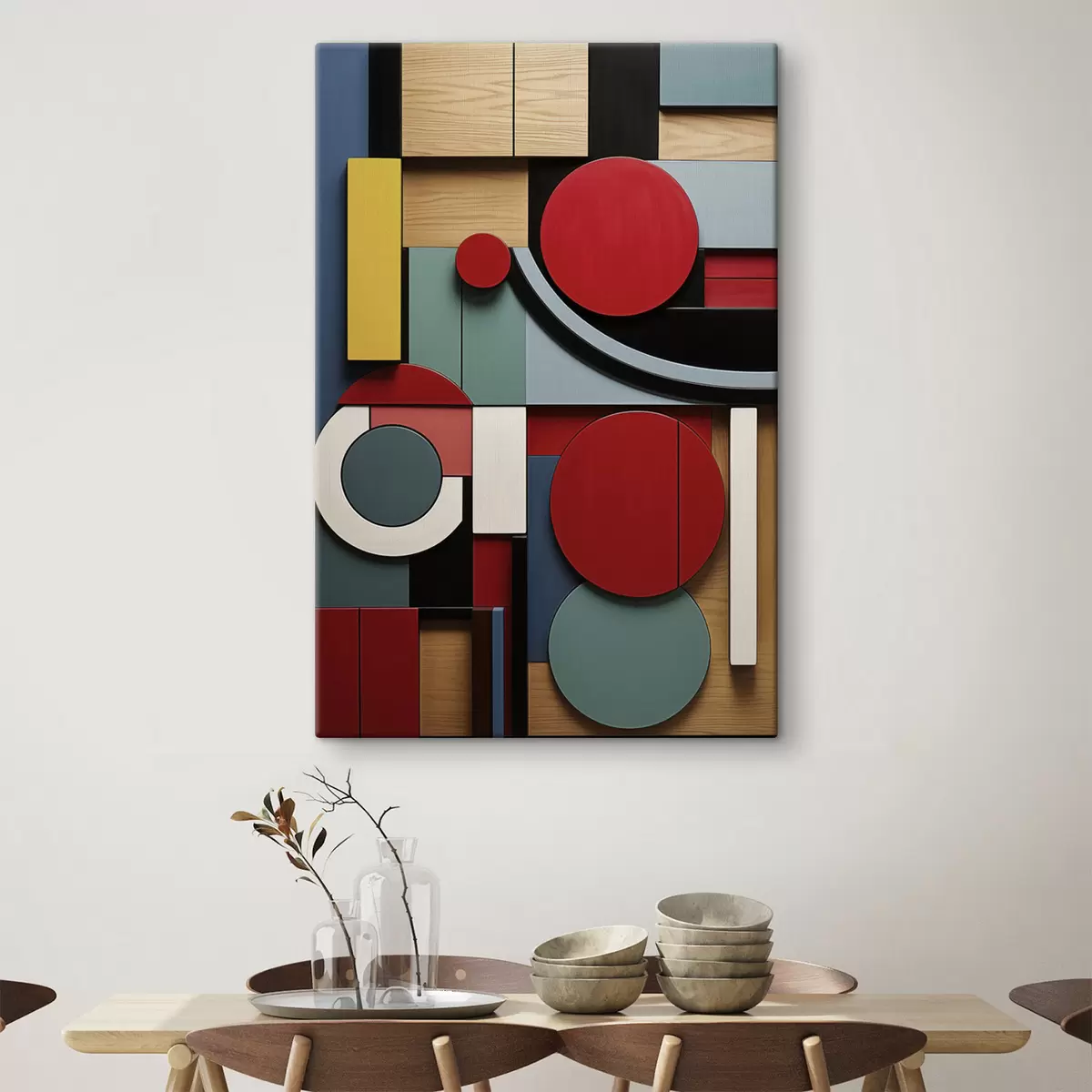 Maalid Abstraktne geomeetriline kompositsioon puidu tekstuuri imitatsiooniga, punased, mustad, valged ja sinakasrohelised ristkülikud ja ringid Nr s47876
