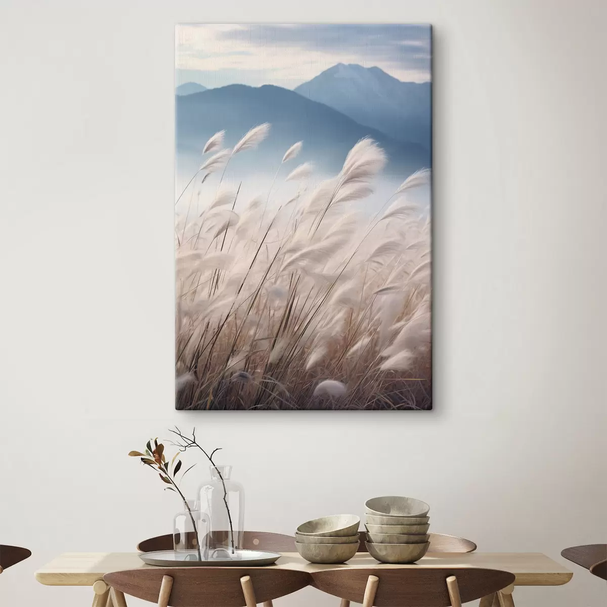 Maalid Pikk, valge pampasrohi tuules lehvimas, taustal pehmed sinised mäed Nr s47879