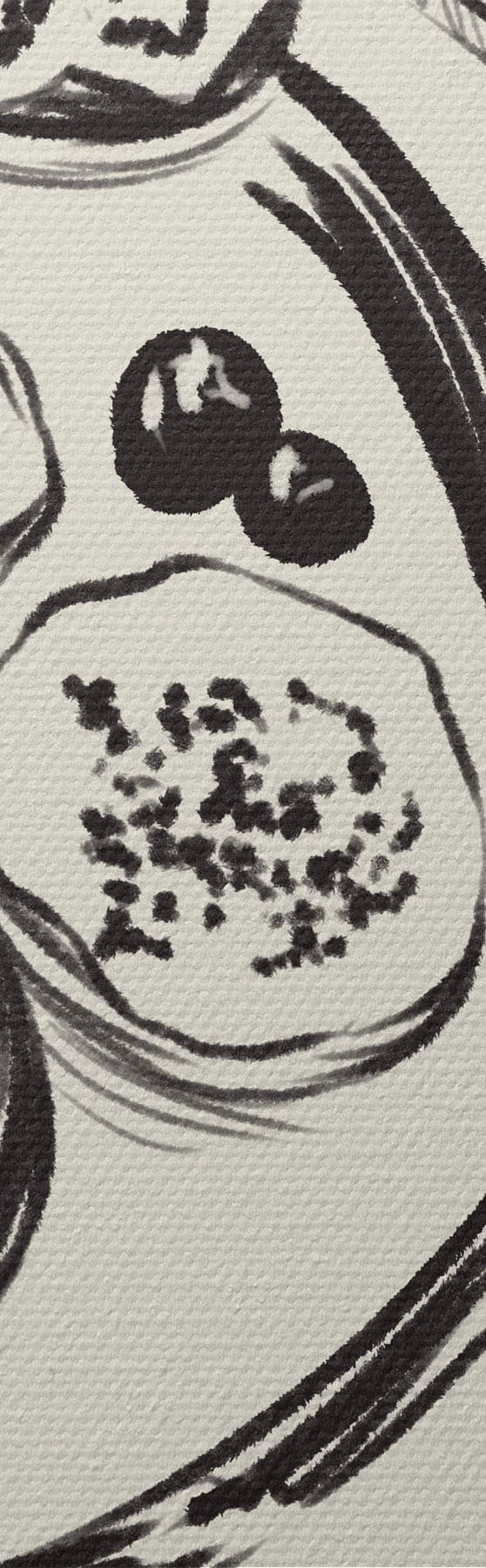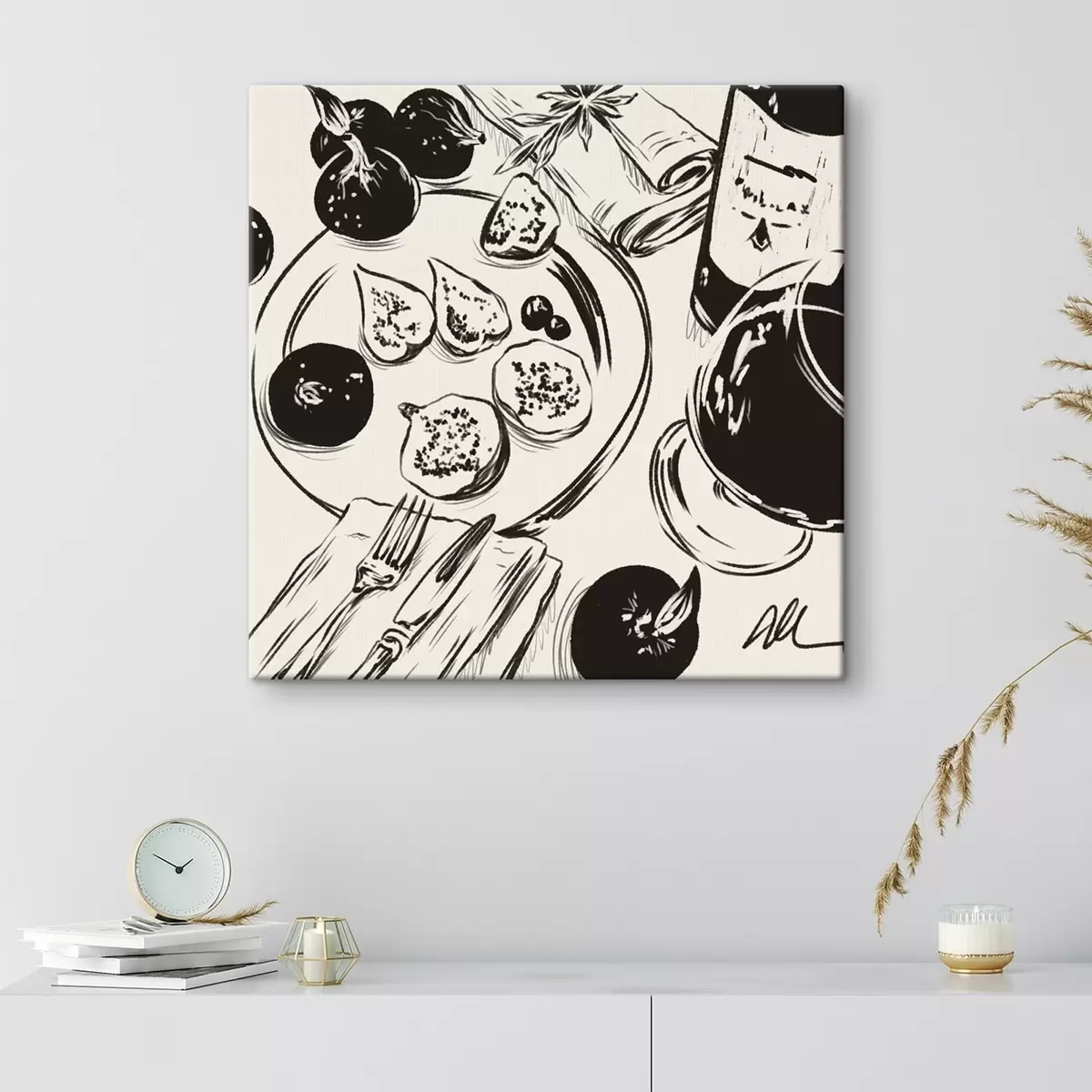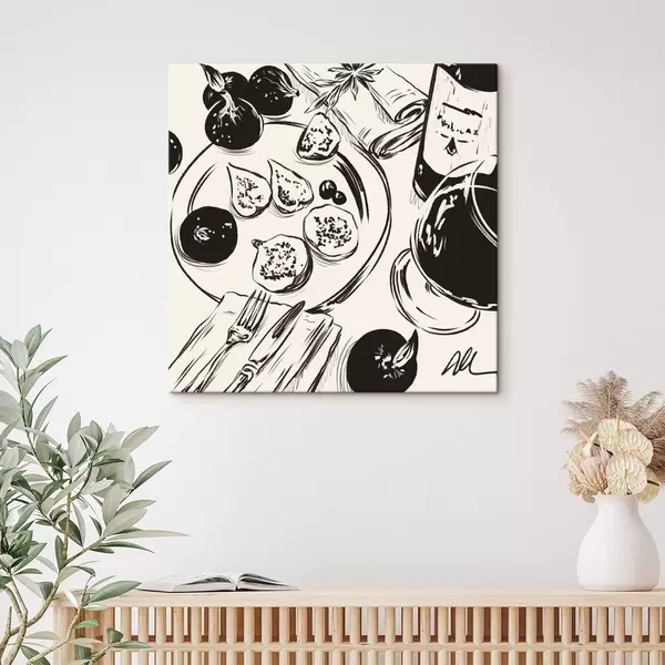 Maalid Mustvalge joonistus laudast, millel on puuviljad ja klaas Nr s48030