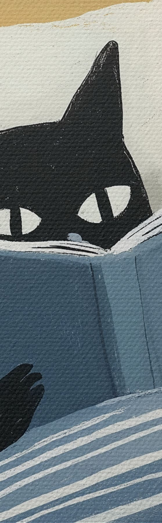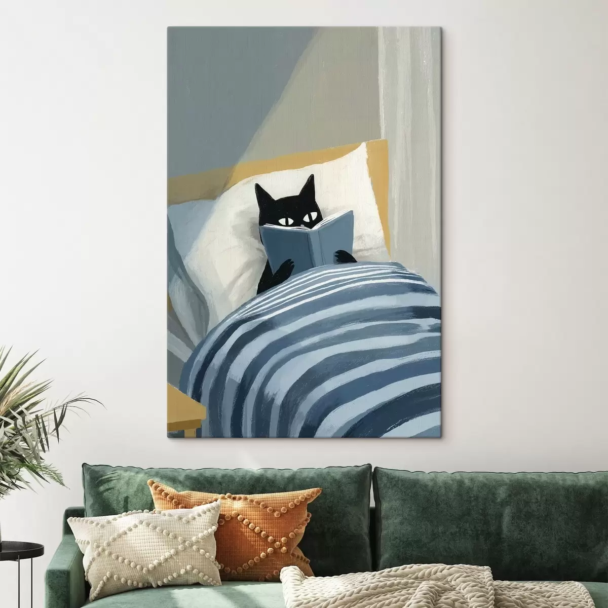 Maalid minimalistlik joonistus mustast kassist, kes loeb voodis raamatut Nr s48117