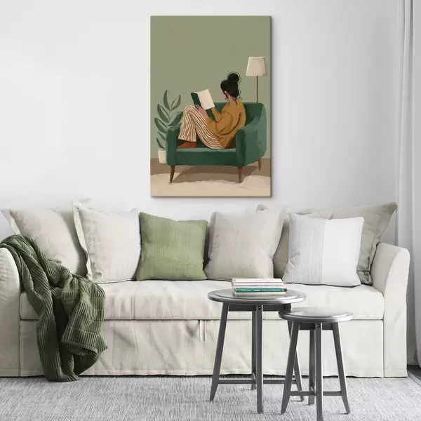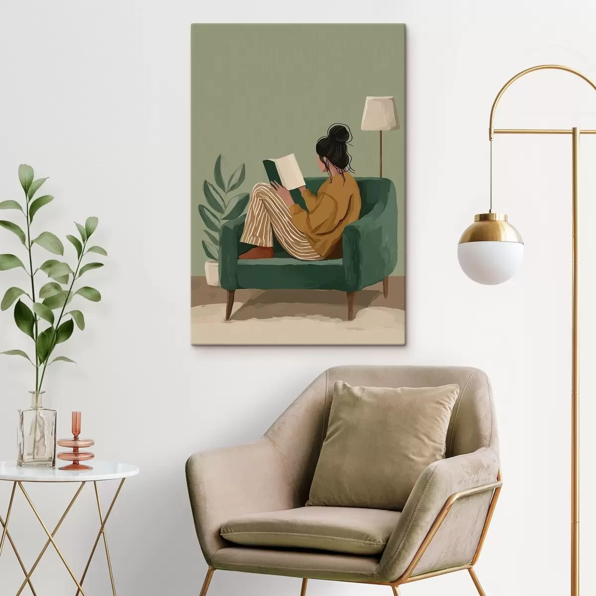 Maalid minimalistlik ja hubane illustratsioon naisest, kes istub tugitoolis ja loeb Nr s48118