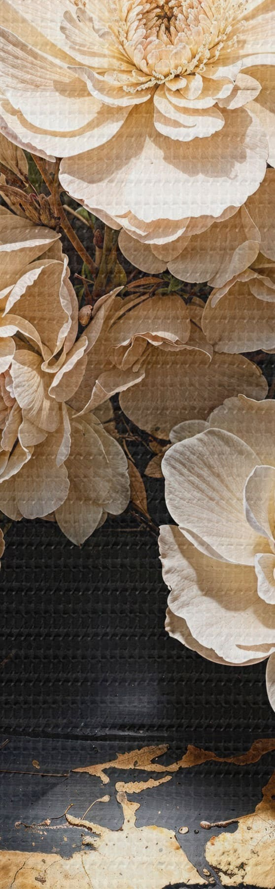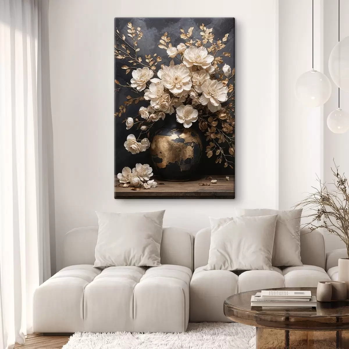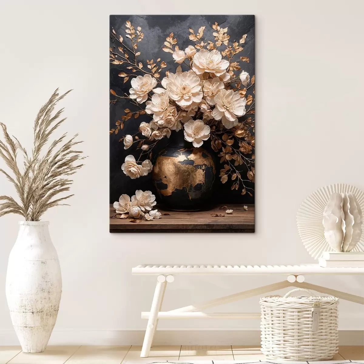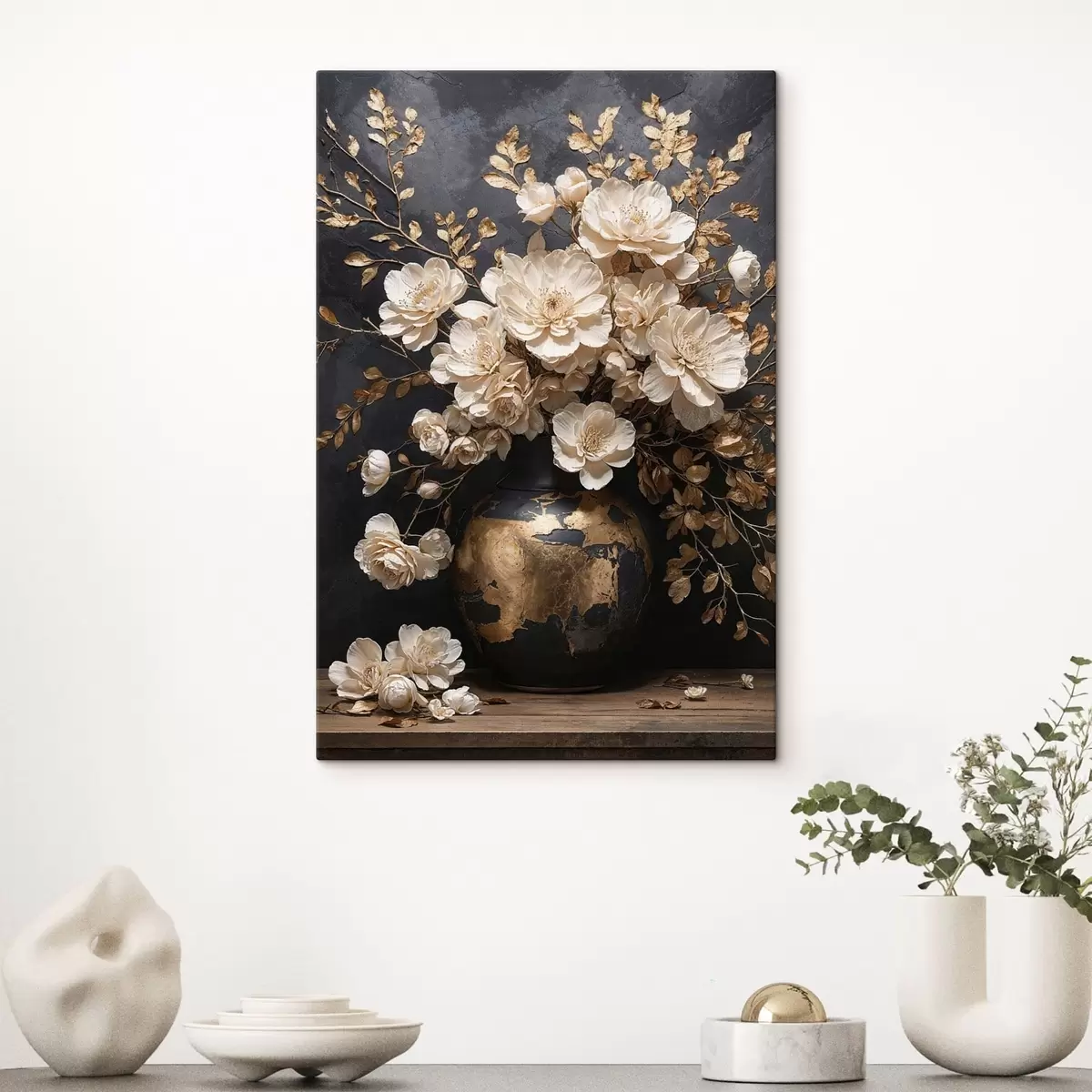 Maalid Heledad lilled vaasis koos dekoratiivsete lehtedega Nr s48356