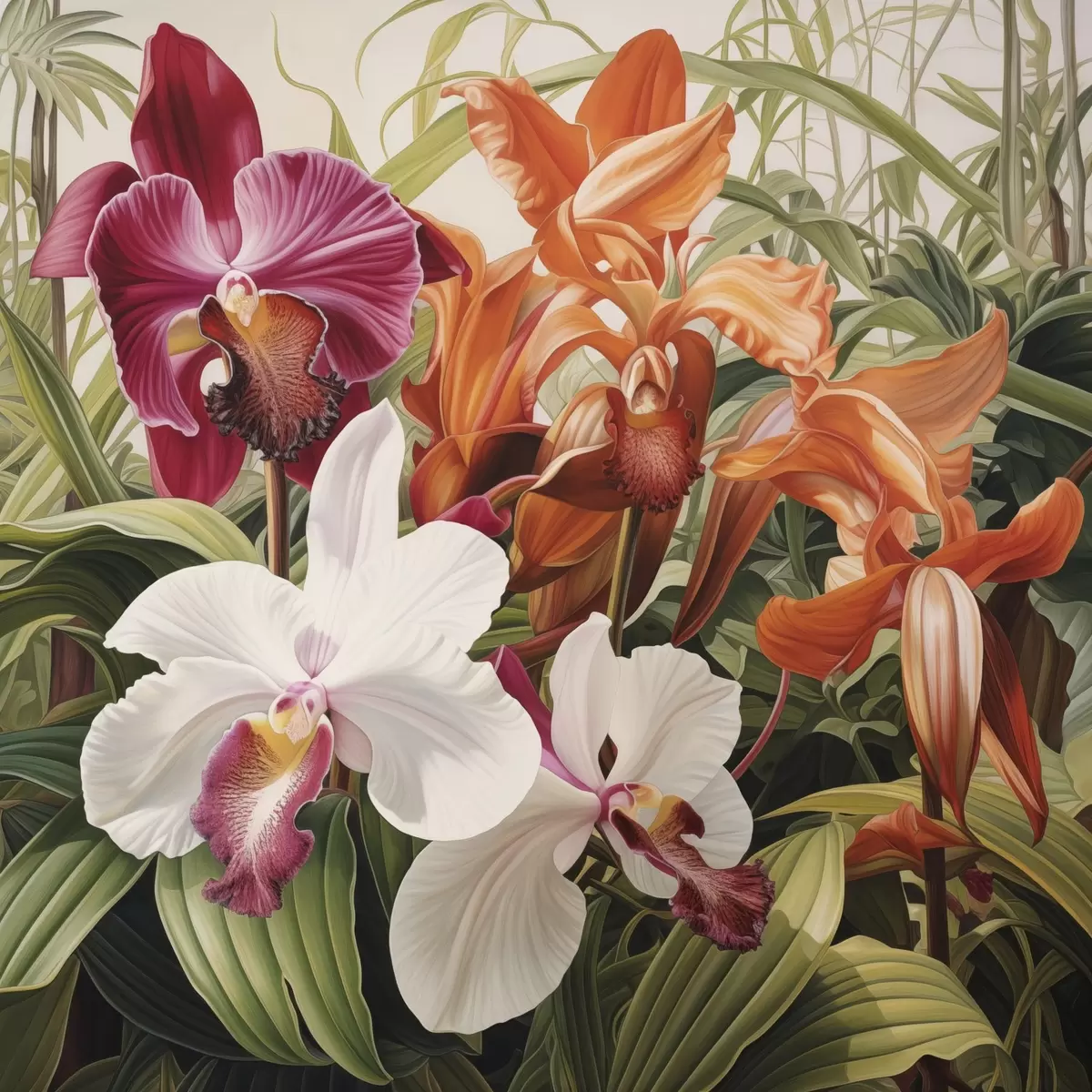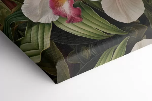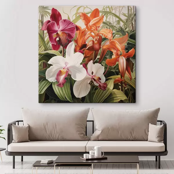 Maalid Troopiliste lillede kimp, taustal rohelise lehestikuga orhideed Nr s48386